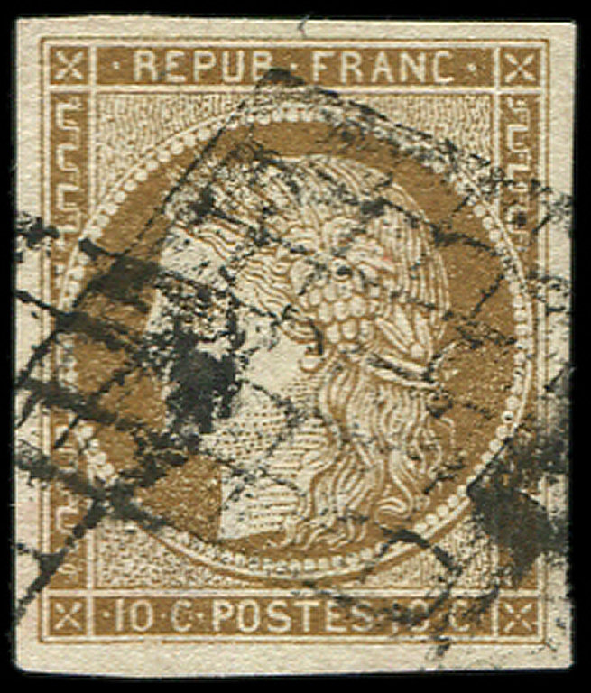 1b 10c. bistre-VERDATRE, obl. GRILLE, TB. C