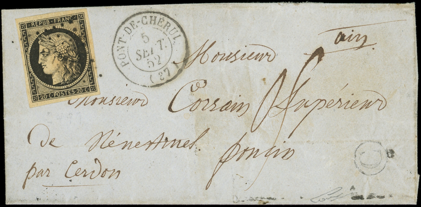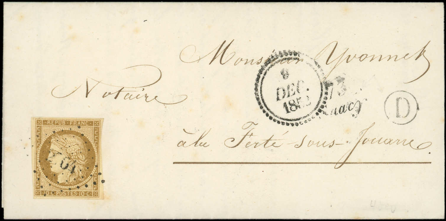 1 10c. bistre-jaune, obl. PC 2764 s. LAC, Cursive 73/SAACY, dateur B 9 DEC 1852, Boite D de PAROUSIN, arr. LA FERTE-S-JOUARRE 10/12, TB