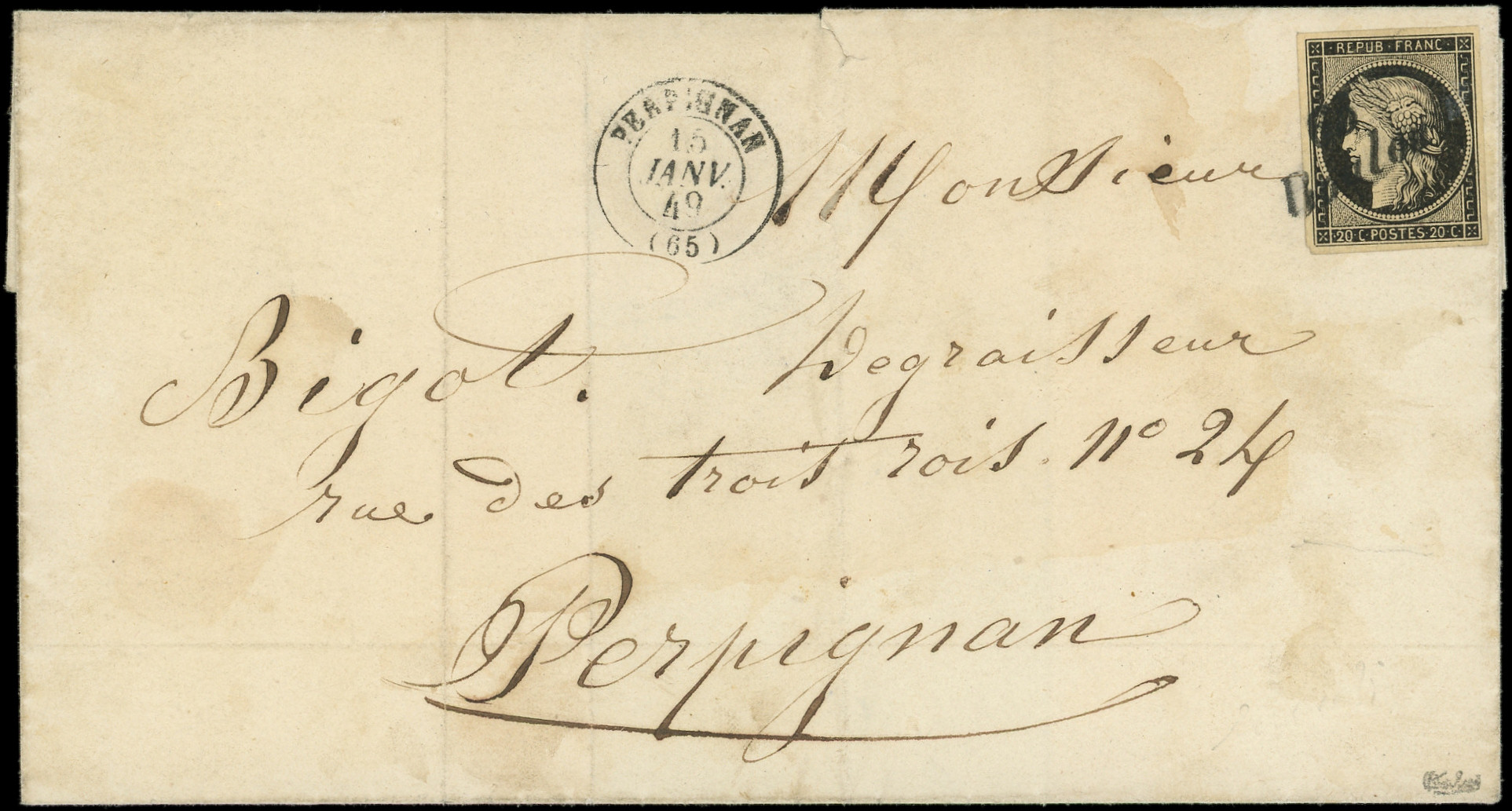 3 20c. noir sur jaune, obl. Cursive 65/BOULOU s. LSC, càd T15 PERPIGNAN 15 JANV 49, grande Rareté Superbe, cote 35 500