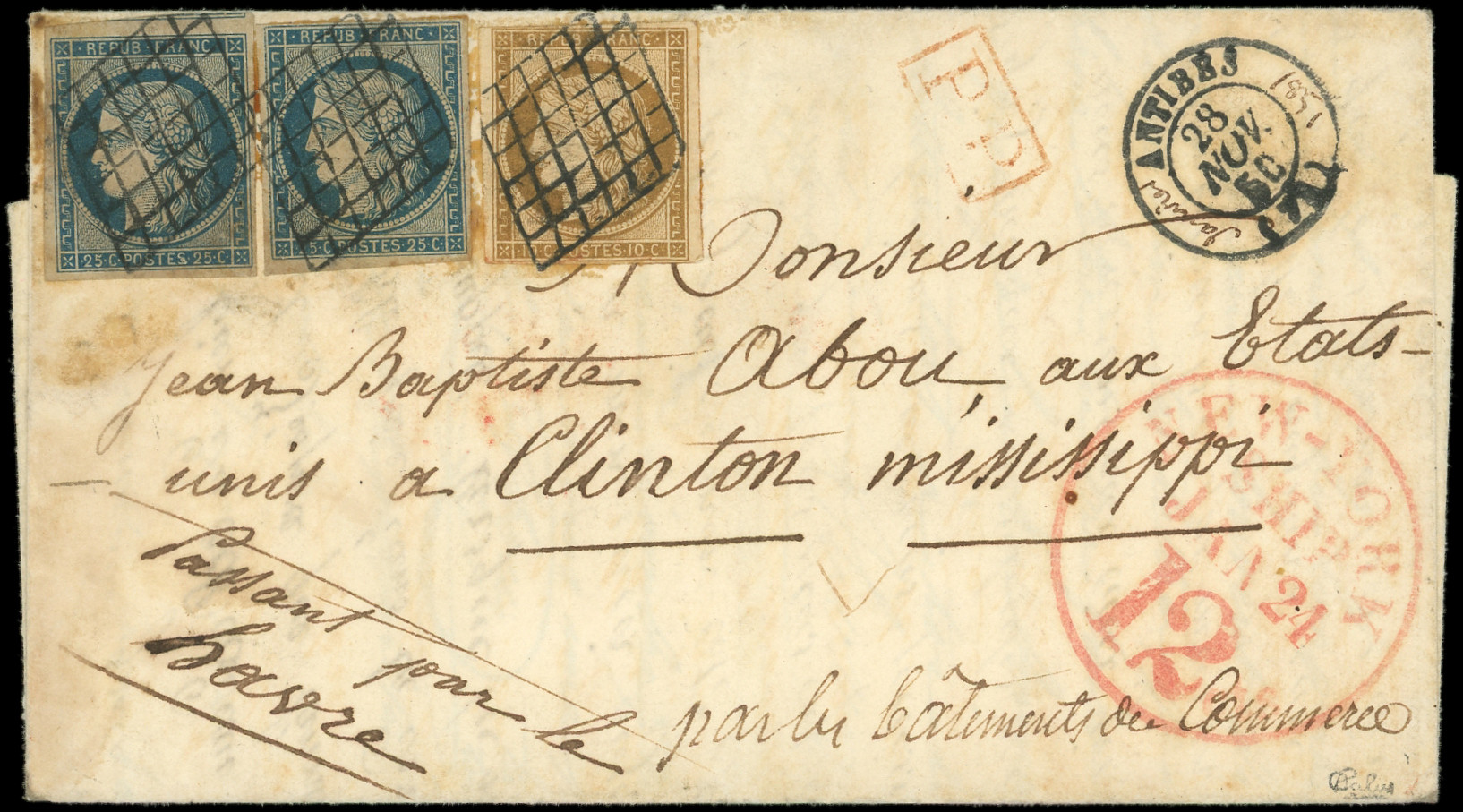 1 et 4, 10c. bistre et 25c. bleu (2), obl. GRILLE s. LAC, càd T15 ANTIBES 28/11/50 et PP rouge, passage NY 24/1 pour CLINTON MISSISSIPPI, Superbe
