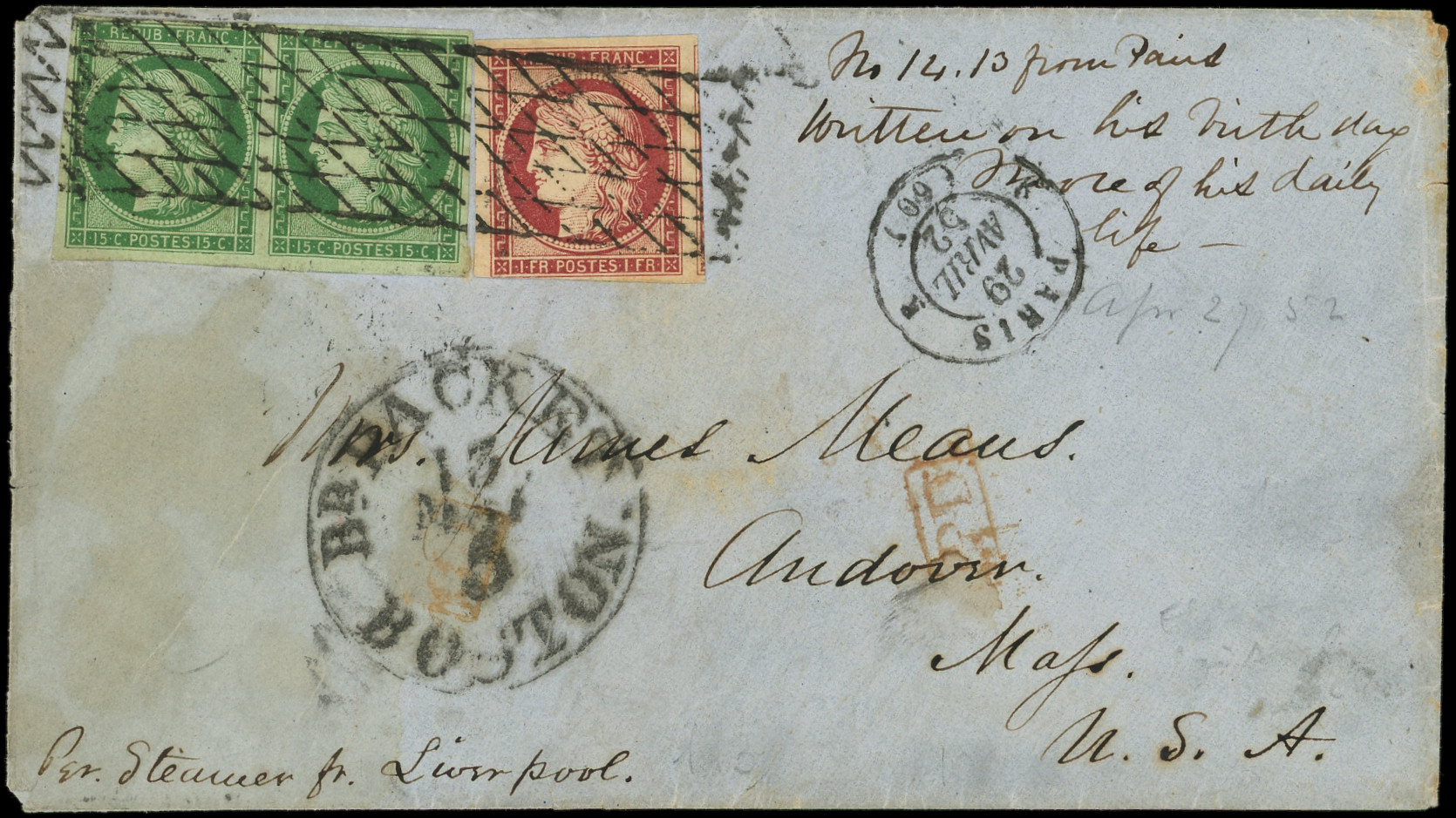 2 et 6, 15c. vert PAIRE et 1f. carmin à peine effl. en angle, obl. GRILLE SANS FIN s. Env., càd Paris 29/4/52, passage BOSTON 15/5 pour ANDOVER MASS., TTB
