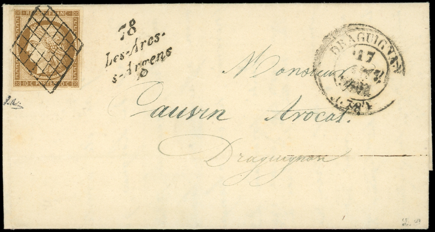 1b 10c. bistre-VERDATRE, obl. GRILLE s. LAC, càd T14 DRAGUIGNAN 17/1/51 et Cursive 78/LES ARCS/S.ARGENS, TTB