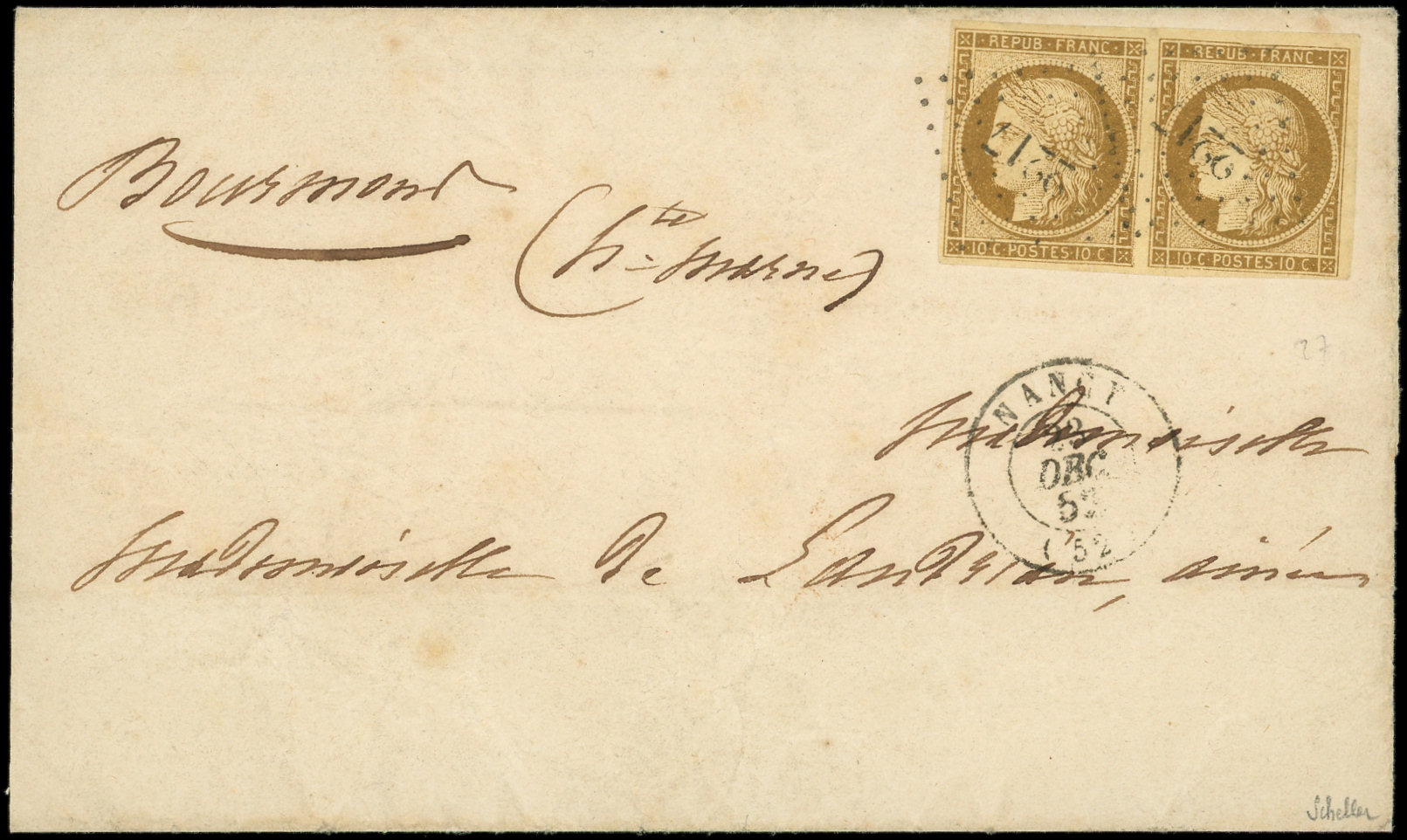 1a 10c. bistre-brun, PAIRE obl. PC 2217 s. LSC, càd T15 NANCY 23/12/52, TTB. S