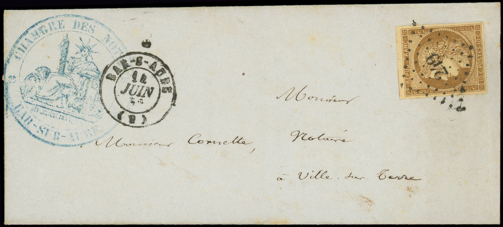 1a 10c. bistre-brun, obl. PC 249 s. LSC, càd T15 BAR-S-AUBE 14/6/52 et cachet bleu de la Chambre des Notaires, TTB
