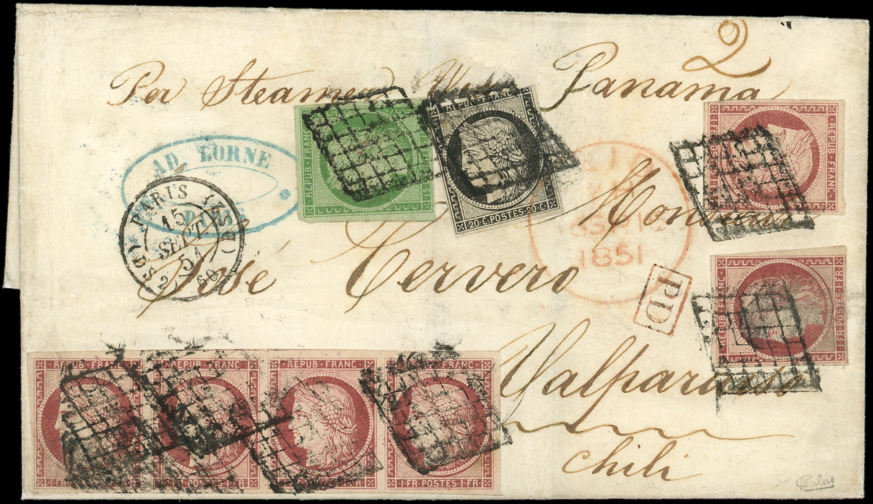 2, 3 et 6, 15c. vert, 20c. noir touché, 1f. carmin BANDE de 4 + 2 ex. obl. GRILLE s. LSC collée s. un support cartonné pour la renforcer, càd (DS2) PARIS (DS2) 15/9/51, passage LONDON 16/9 pour VALPARAISO CHILI, affrt QUADRICOLORE probablement UNIQUE. C