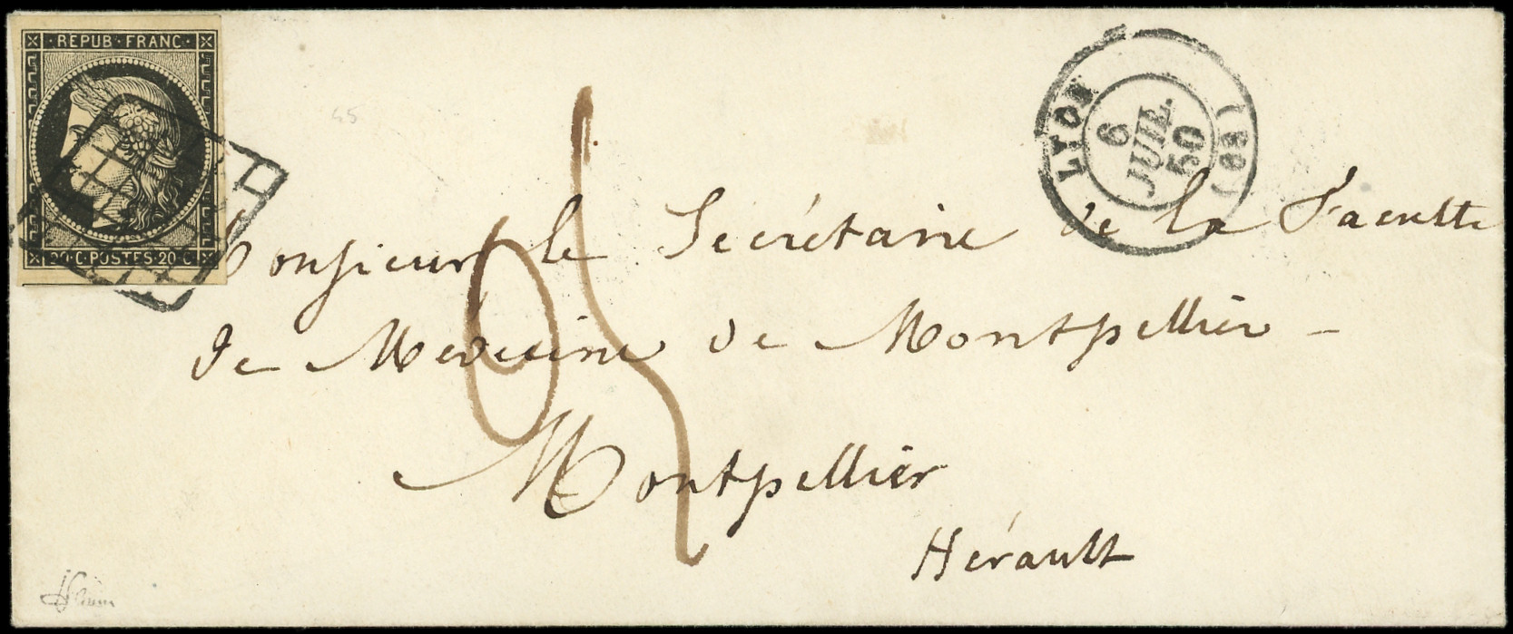 3 20c. noir sur jaune, obl. GRILLE s. Env., càd T15 LYON 6/7/50, TAXE 05 plume pour application du NOUVEAU tarif à 25c. depuis le 1/7, Superbe