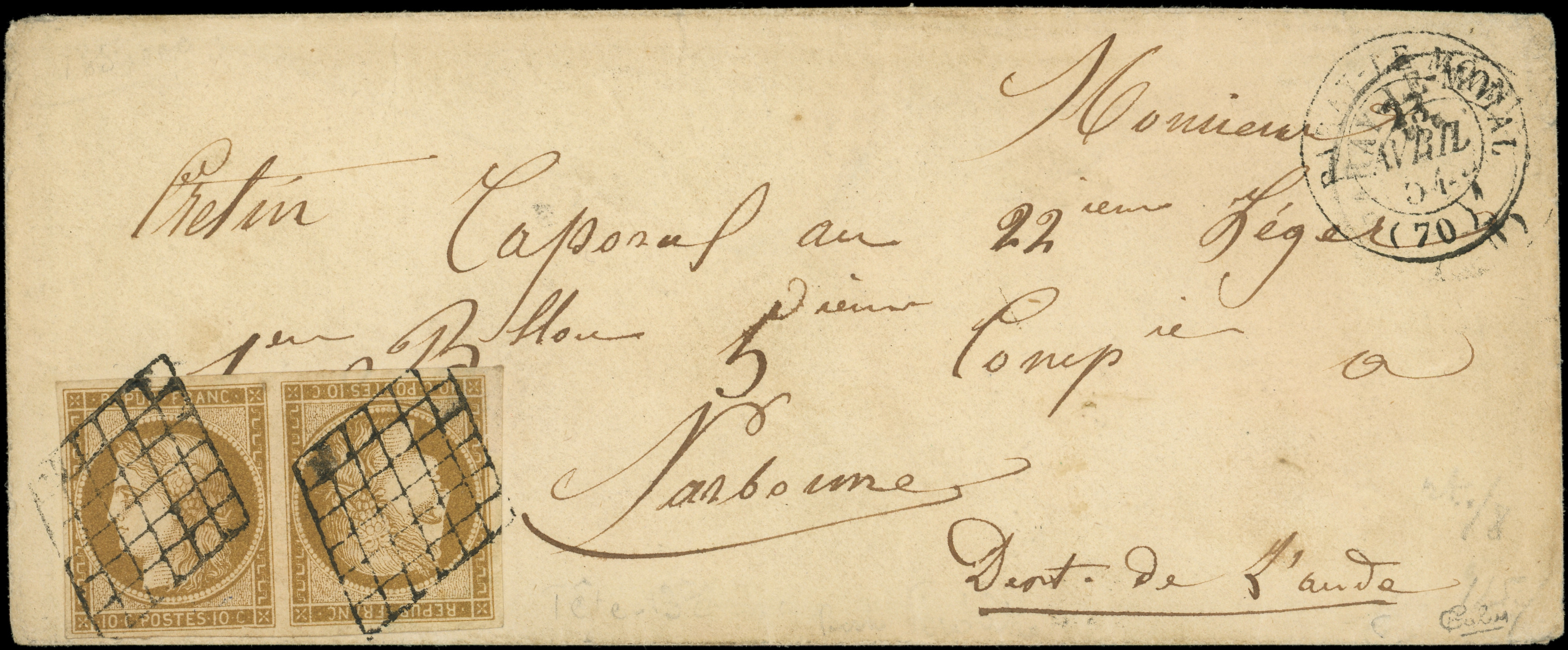 1b 10c. bistre-VERDATRE, PAIRE obl. GRILLE s. LSC, arr. VARENNES-S-AMANCE 9/6/51, TTB