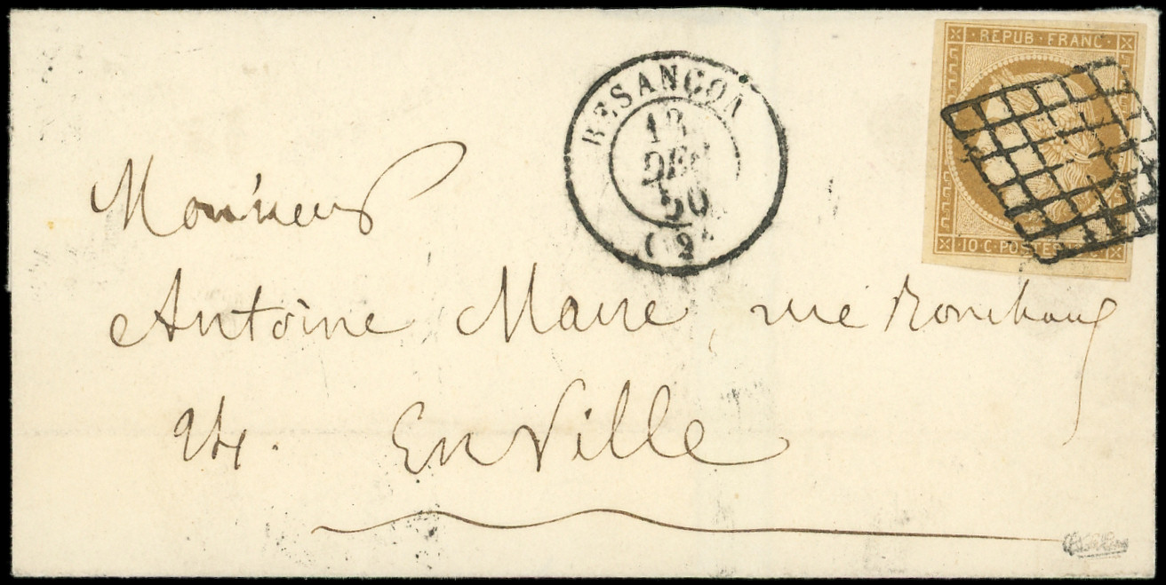1 10c. bistre-jaune, obl. GRILLE s. LSC locale, càd T15 BESANCON 13/12/50, Superbe