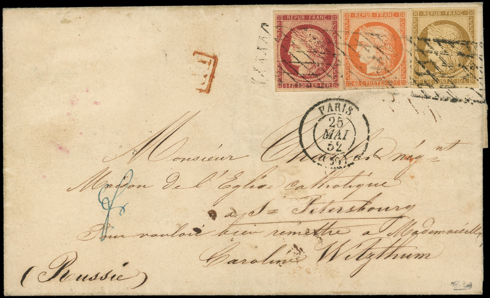 1,5 et 6, 10c., 40c. et 1f. obl. GRILLE SANS FIN s. LSC, càd Paris 25/5/52, passage BERLIN 27/5 et arr. St PETERSBOURG 21/5 julien, combinaison TRICOLORE Superbe