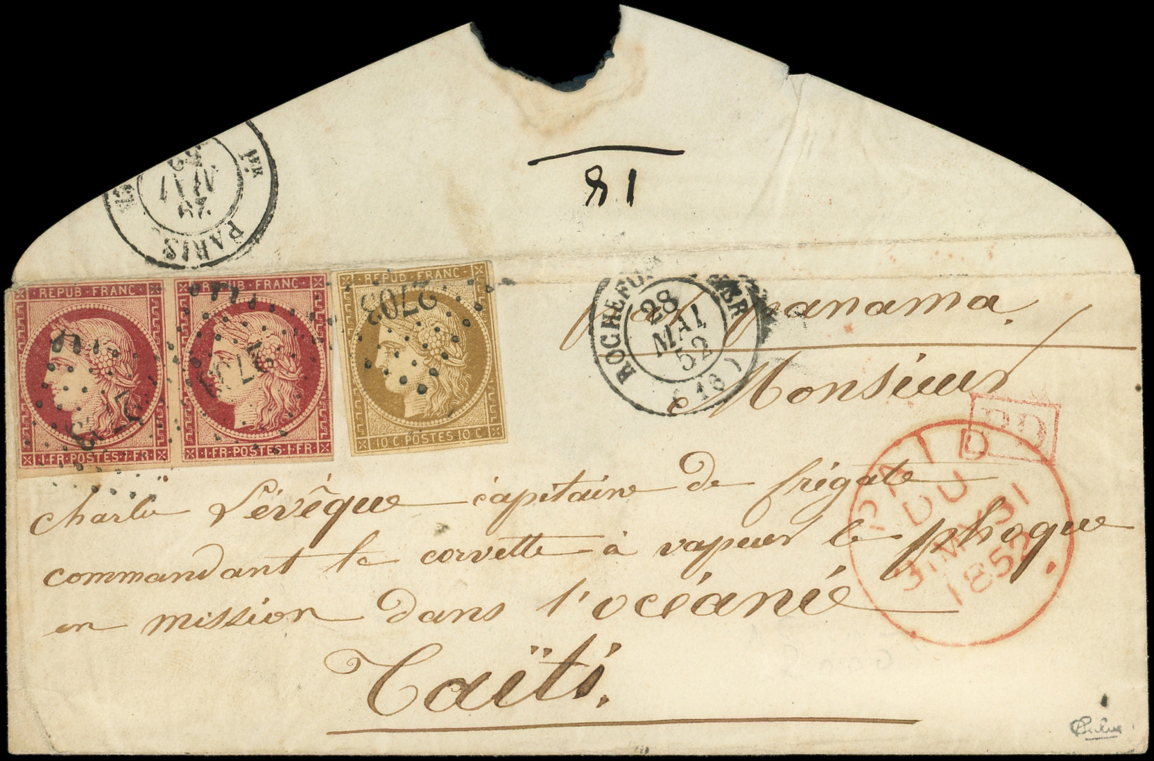 1 et 6, 10c. et 1f. PAIRE, p.d., obl. PC 2703 s. Env., càd T15 ROCHEFORT-S-MER 28/5/52, destinée à l'officier commandant la corvette à vapeur Le Phoque, dans l'Océanie TAITI. Passage LONDON 31/5 puis voie de PANAMA par la terre, le canal ne sera ouvert qu'en 1914. La lettre empruntera ensuite un paquebot anglais longeant la côte méridionale de l'Amérique du Sud pour atteindre sa destination. Ensemble RR et très plaisant. C