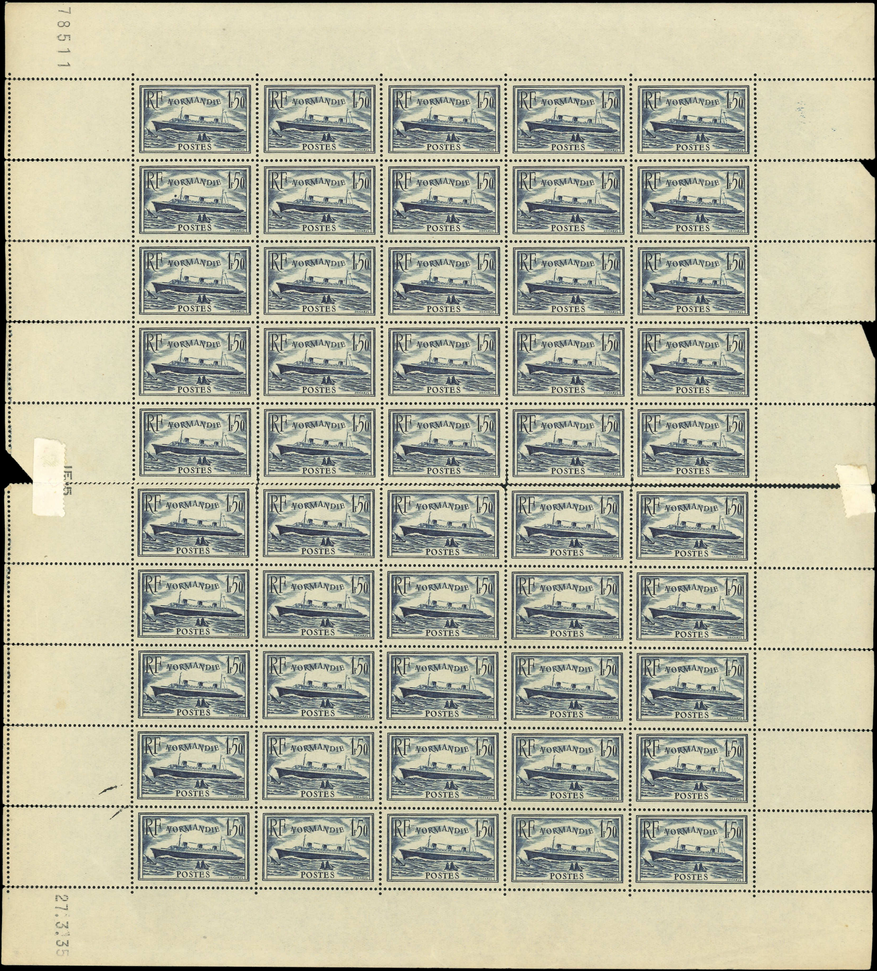 299 Normandie, 1f.50 bleu, FEUILLE de 50 CD 27/3/35, renforcée par des ch. mais tous les timbres sont parfaits, TB