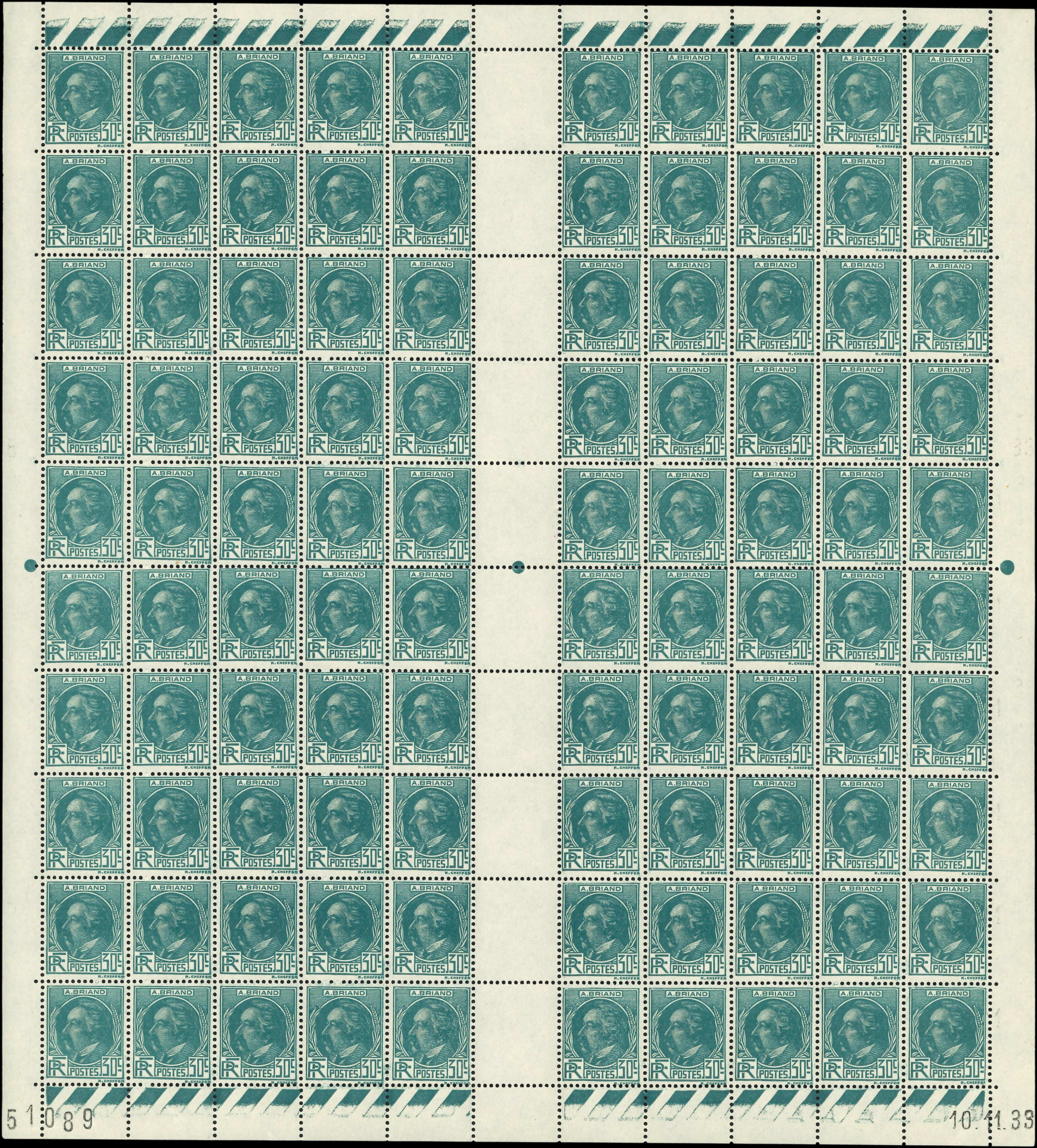 291 A. Briand, 30c. bleu-vert, FEUILLE de 100 CD 10/11/33, TB