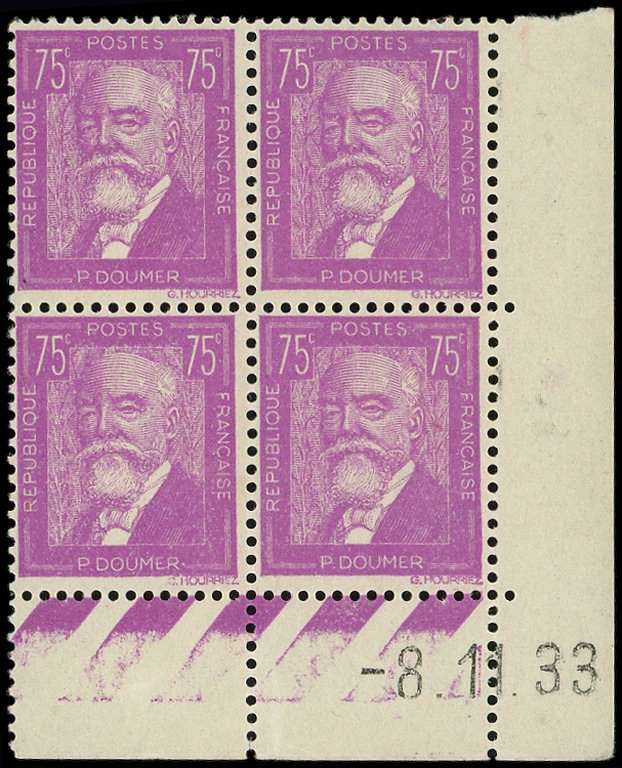 292 P. Doumer, 75c. lilas, BLOC de 4 CD 8/11/33, TB