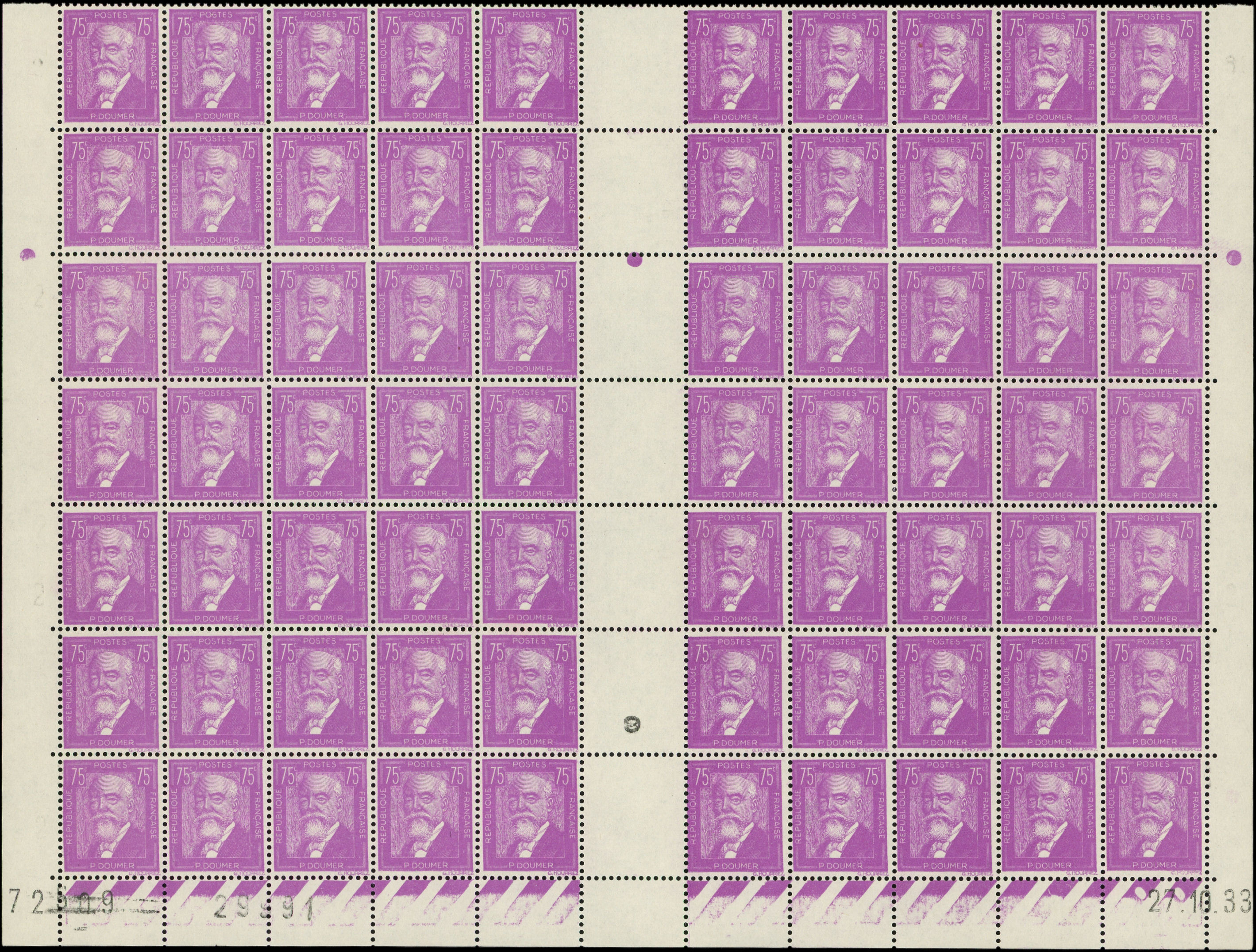 292 P. Doumer, 75c. lilas, PANNEAU de 70, CD 27/10/33, TB