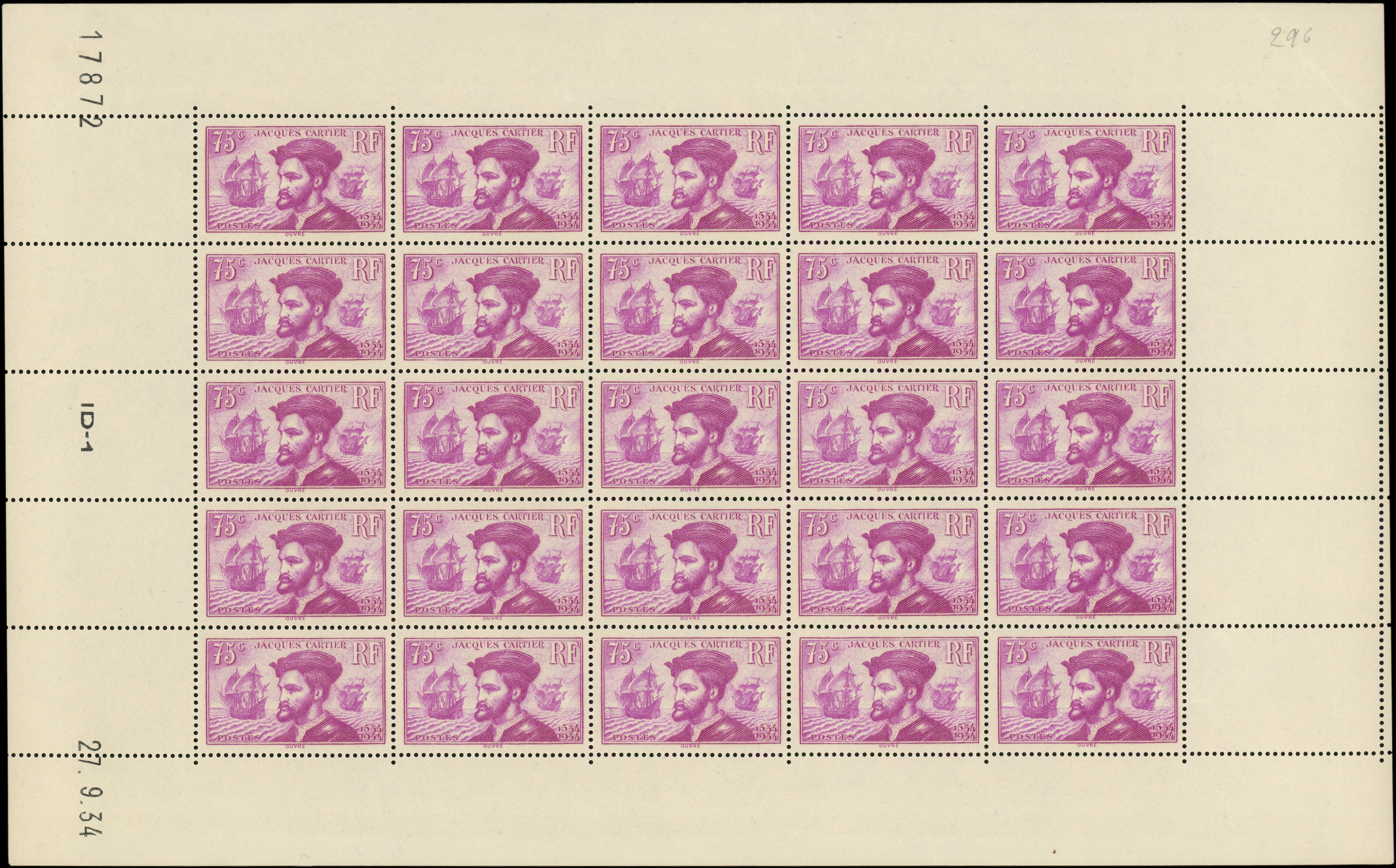 296 J. Cartier, 75c. rose, FEUILLE de 25, CD 27/9/34, TB
