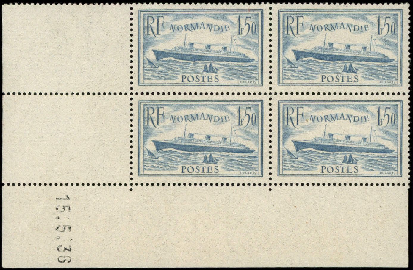 300 Normandie, 1f.50 bleu clair, BLOC de 4 CD 15/5/39, 1 ex. *, TB