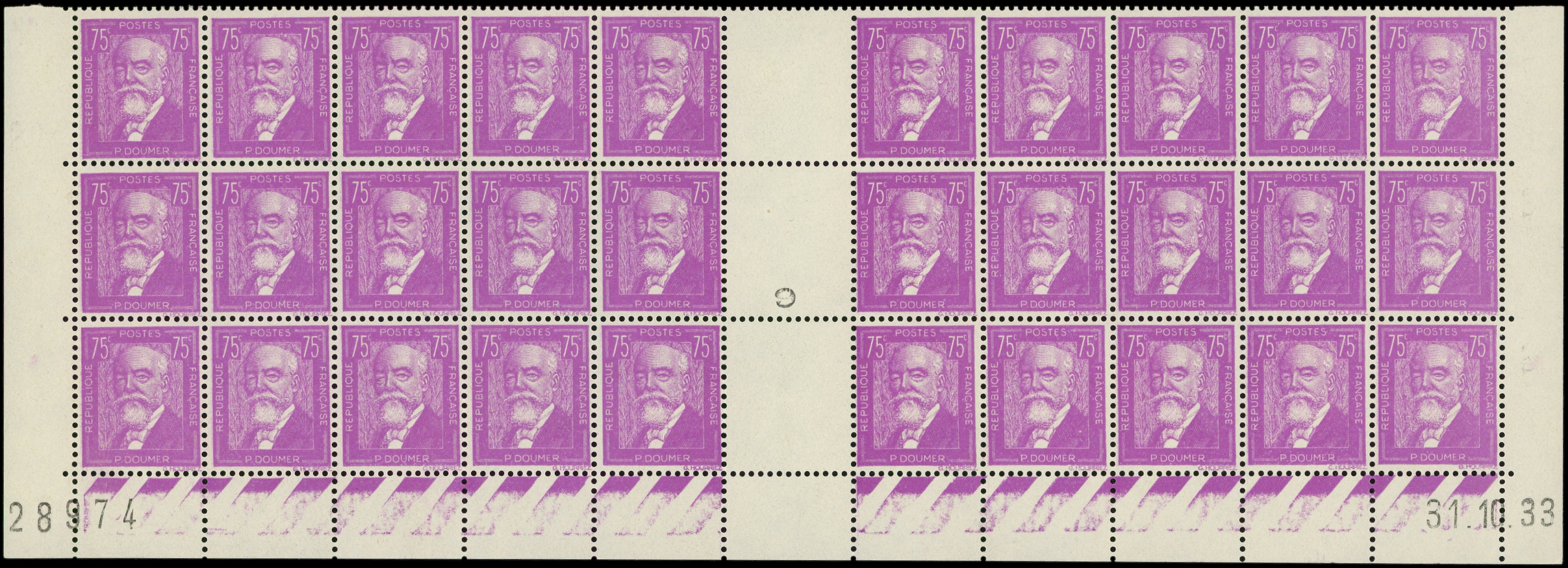 292 P. Doumer, 75c. lilas, BLOC de 30 bas de feuille CD 31/10/33, TB