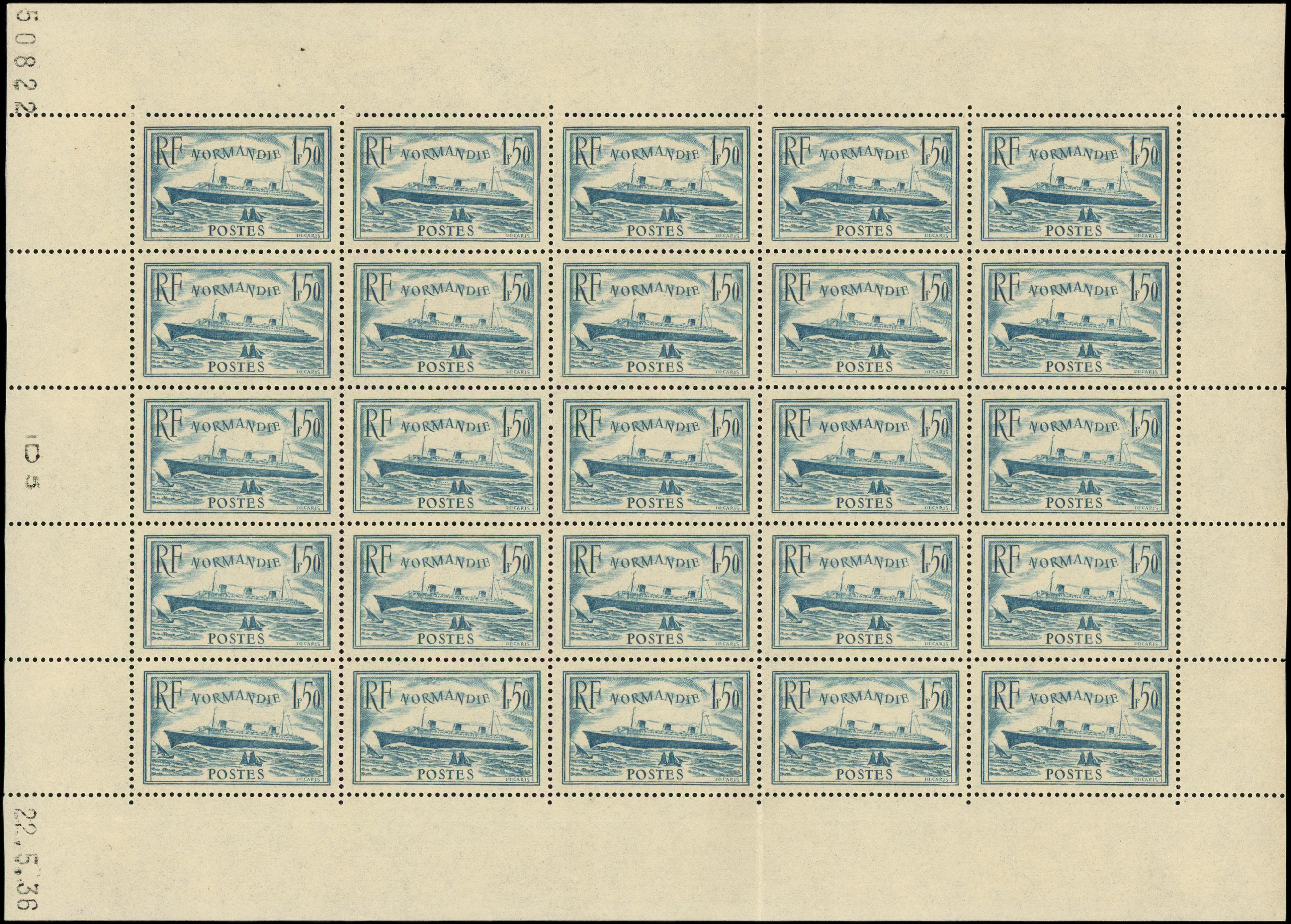 300 Normandie, 1f.50 bleu clair, FEUILLE de 25, CD 22/5/36, TB