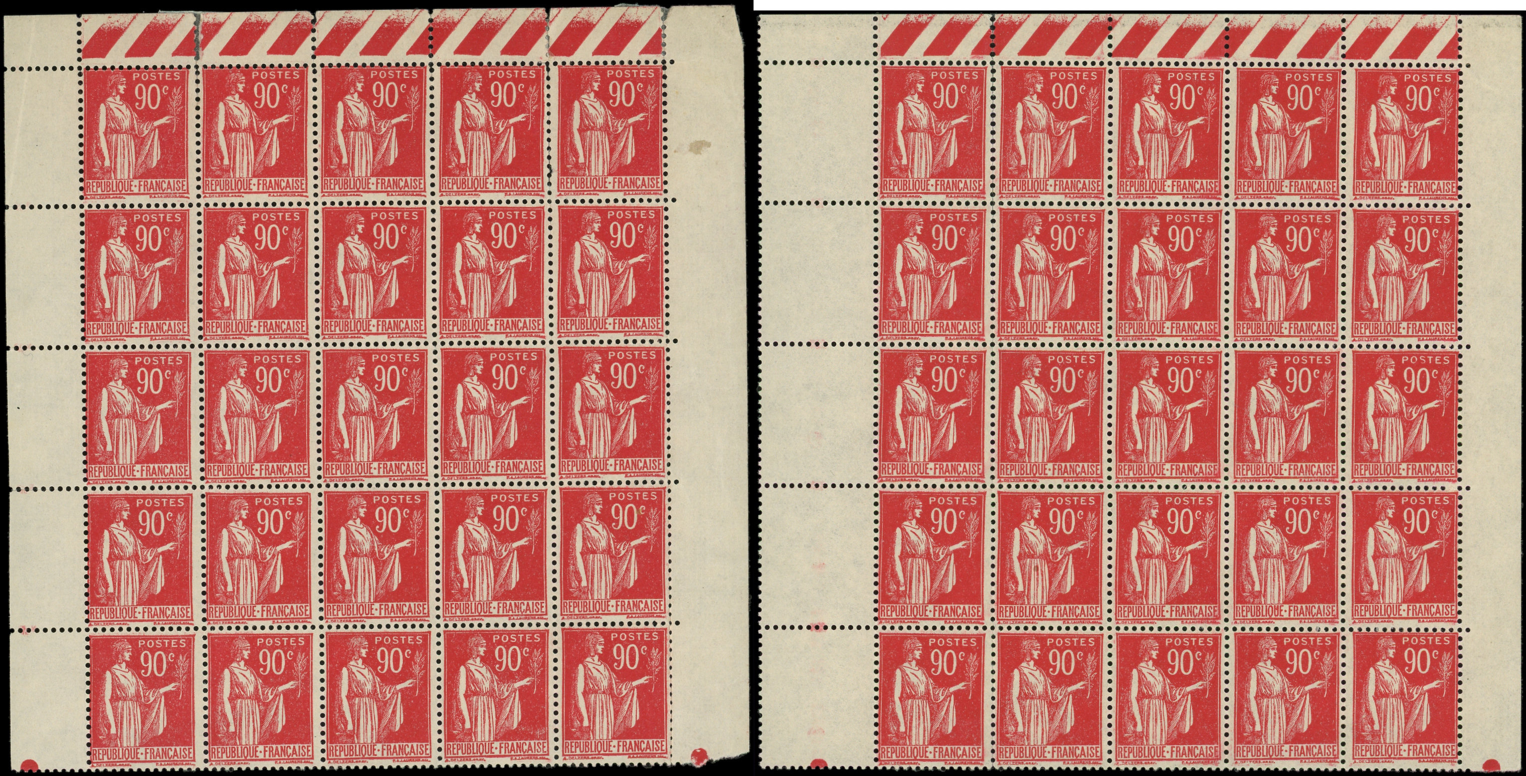 285 Paix, 90c. rouge, 2 BLOCS de 25, TB