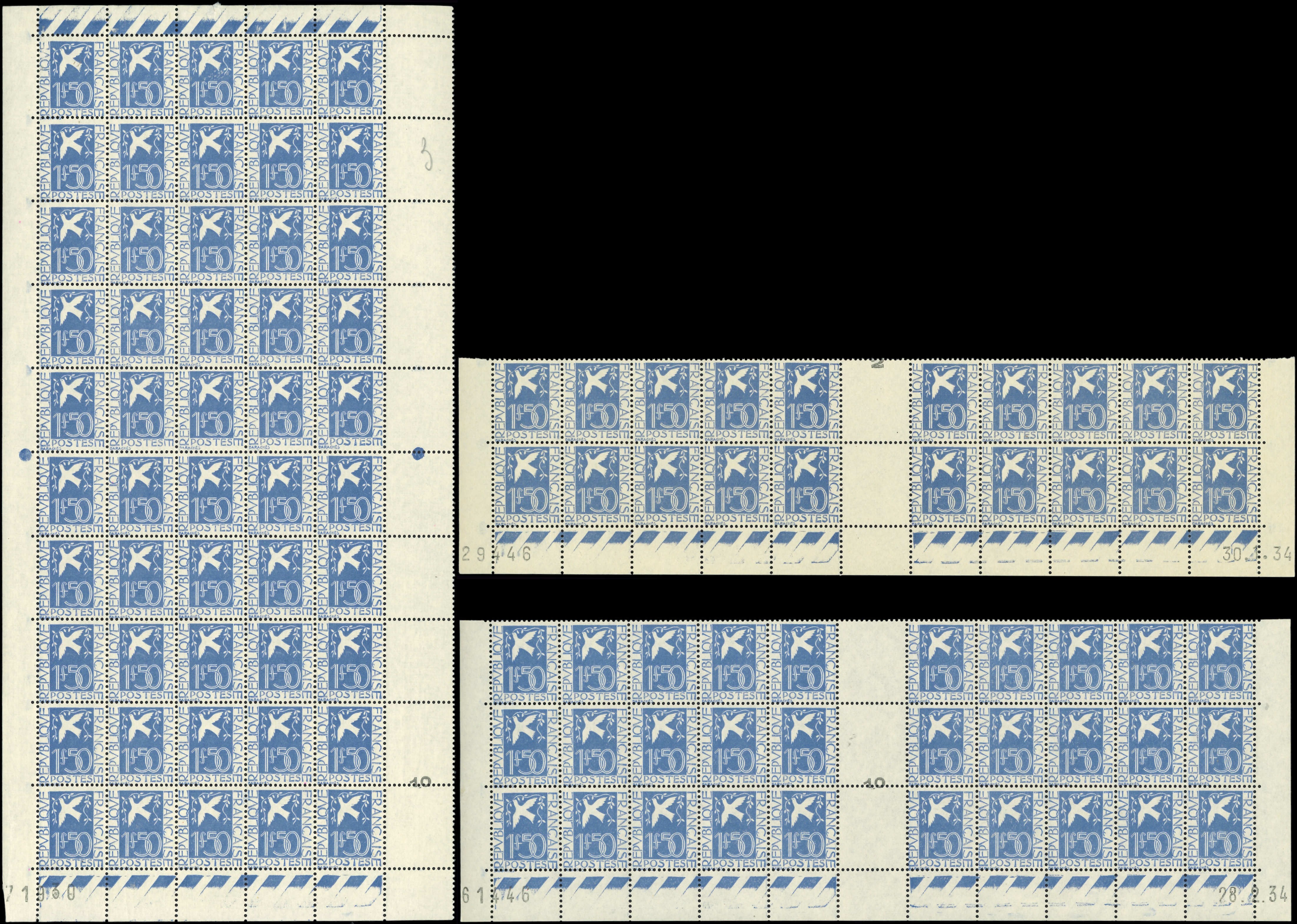 294 Colombe de la Paix, 125 ex. dont un PANNEAU de 50, 1 BLOC de 25 CD 29/1/34, 1 BLOC de 30 CD 28/2/34, 1 BLOC de 20 CD 30/1/34, TB