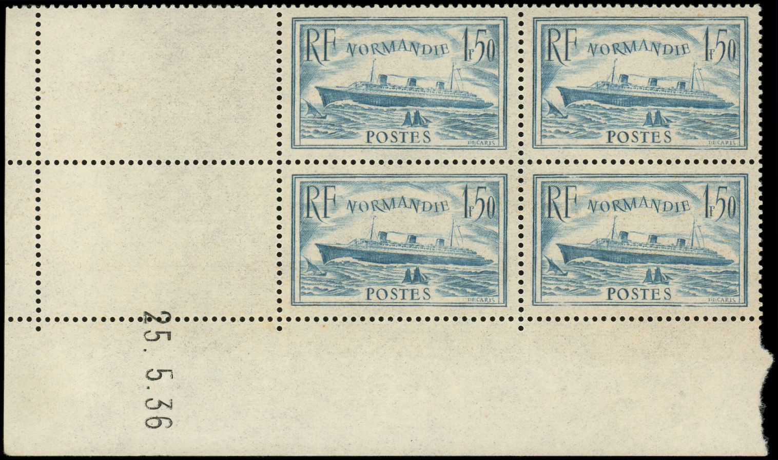300 Normandie, 1f.50 bleu clair, BLOC de 4 CD 25/5/36, TB