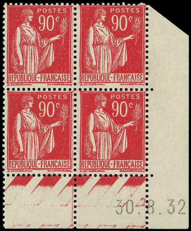 285 Paix, 90c. rouge carminé, BLOC de 4 CD 30/8/32, TB