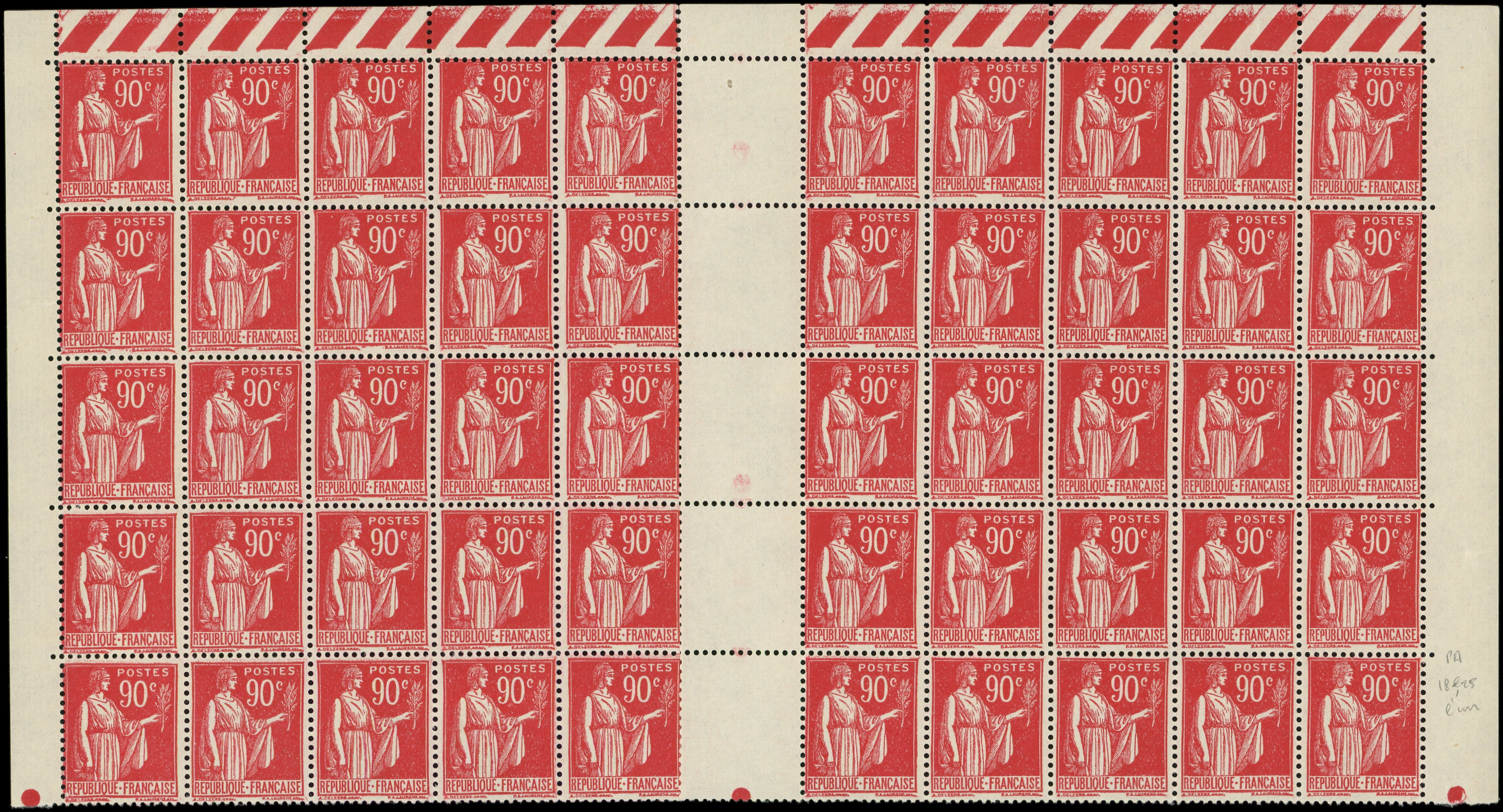 285 Paix, 90c. rouge carminé, PANNEAU de 50, TB