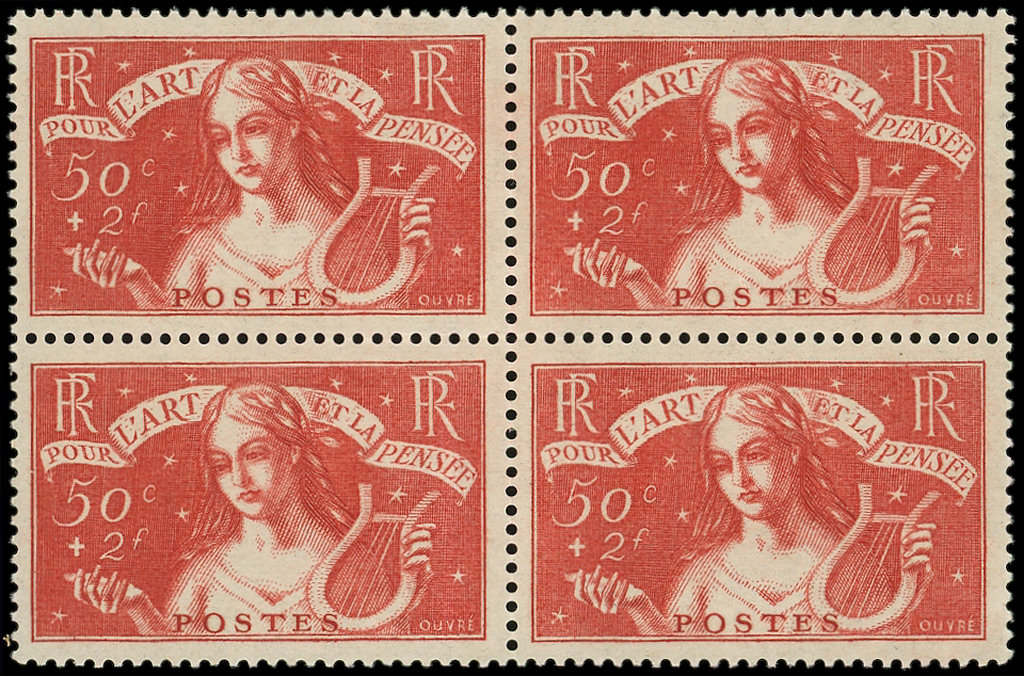 308 Art et Pensée, 50c. + 2f. rouge-brique, BLOC de 4, petit pli de gomme sur 2 ex., TB