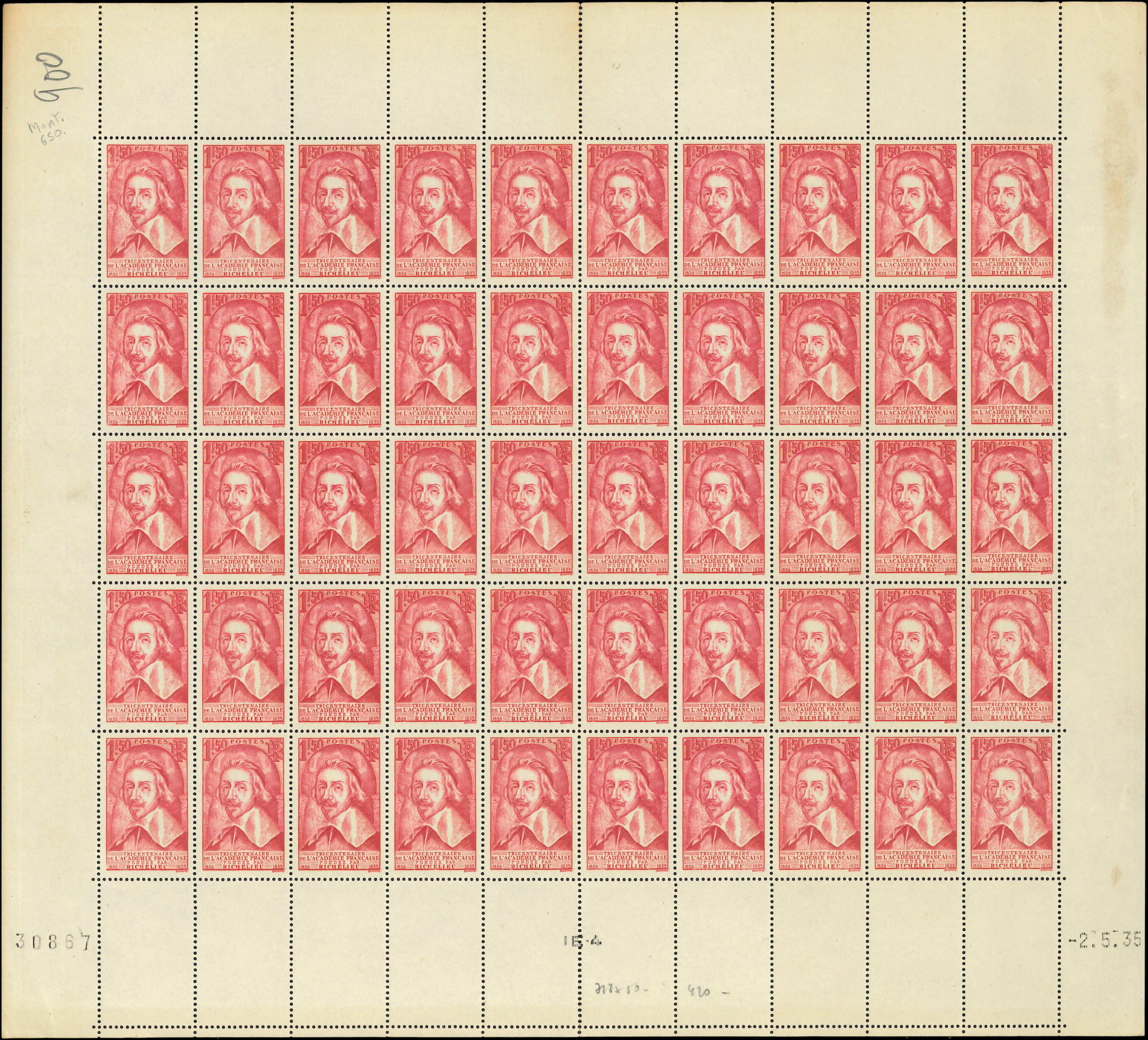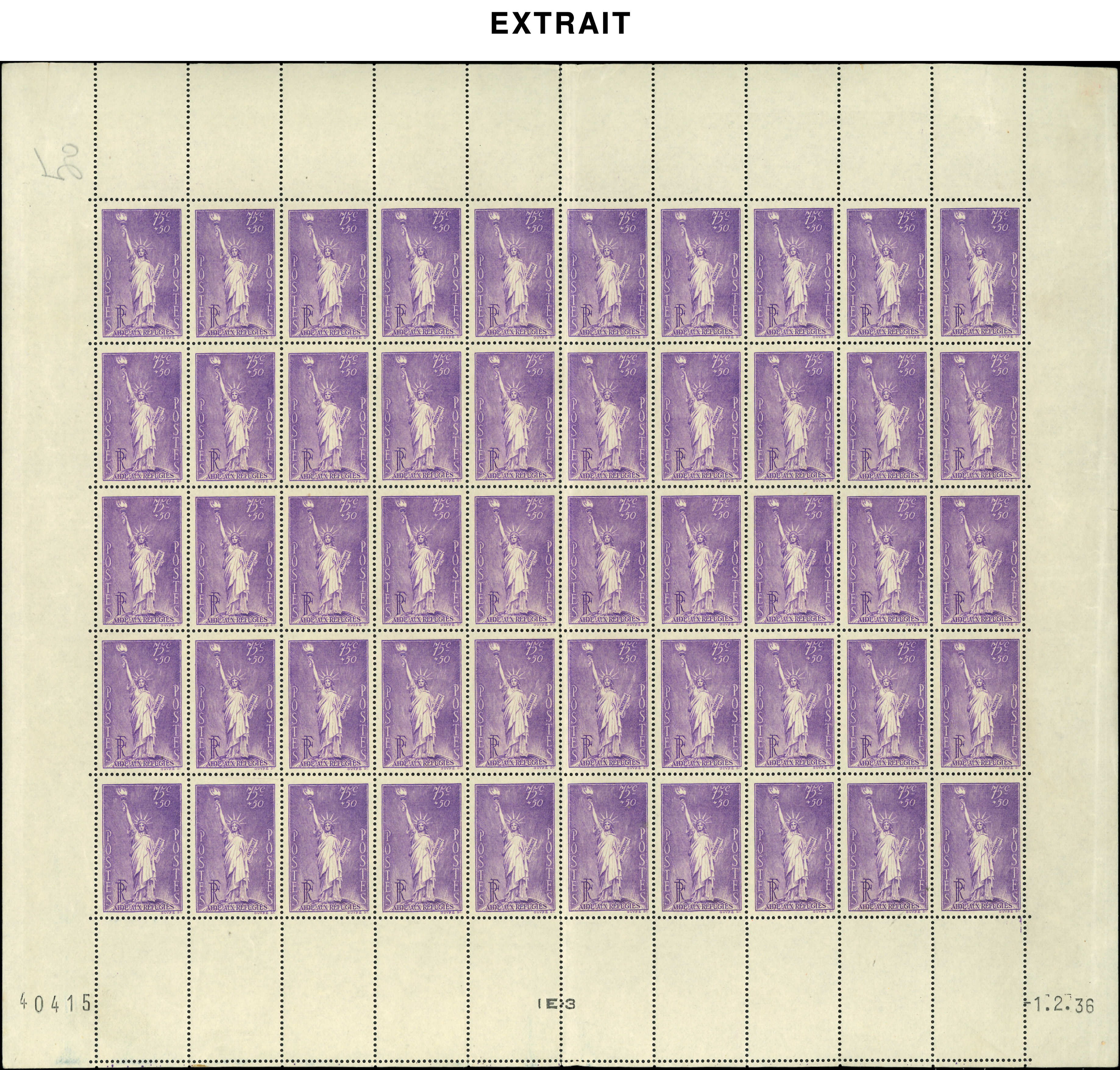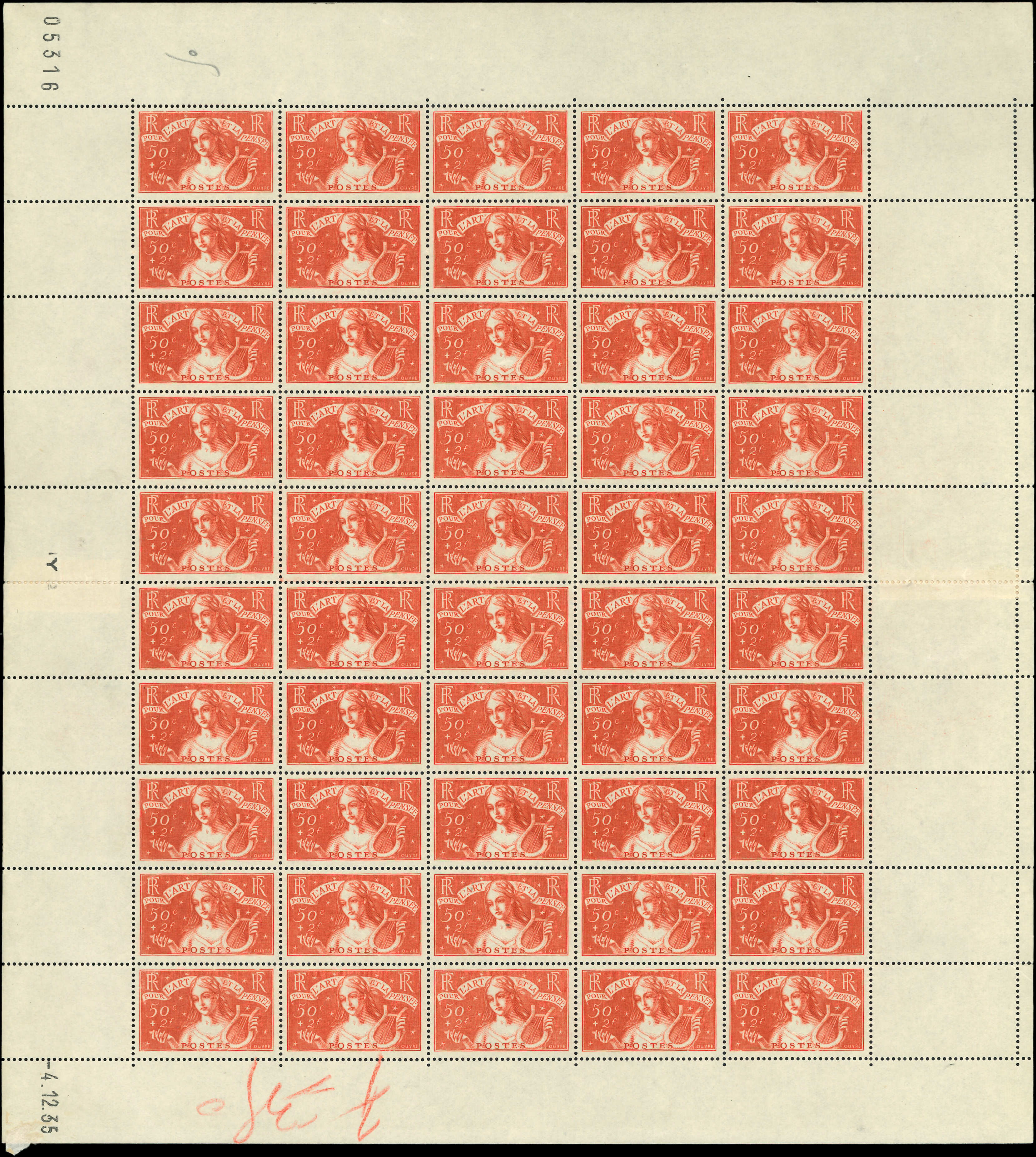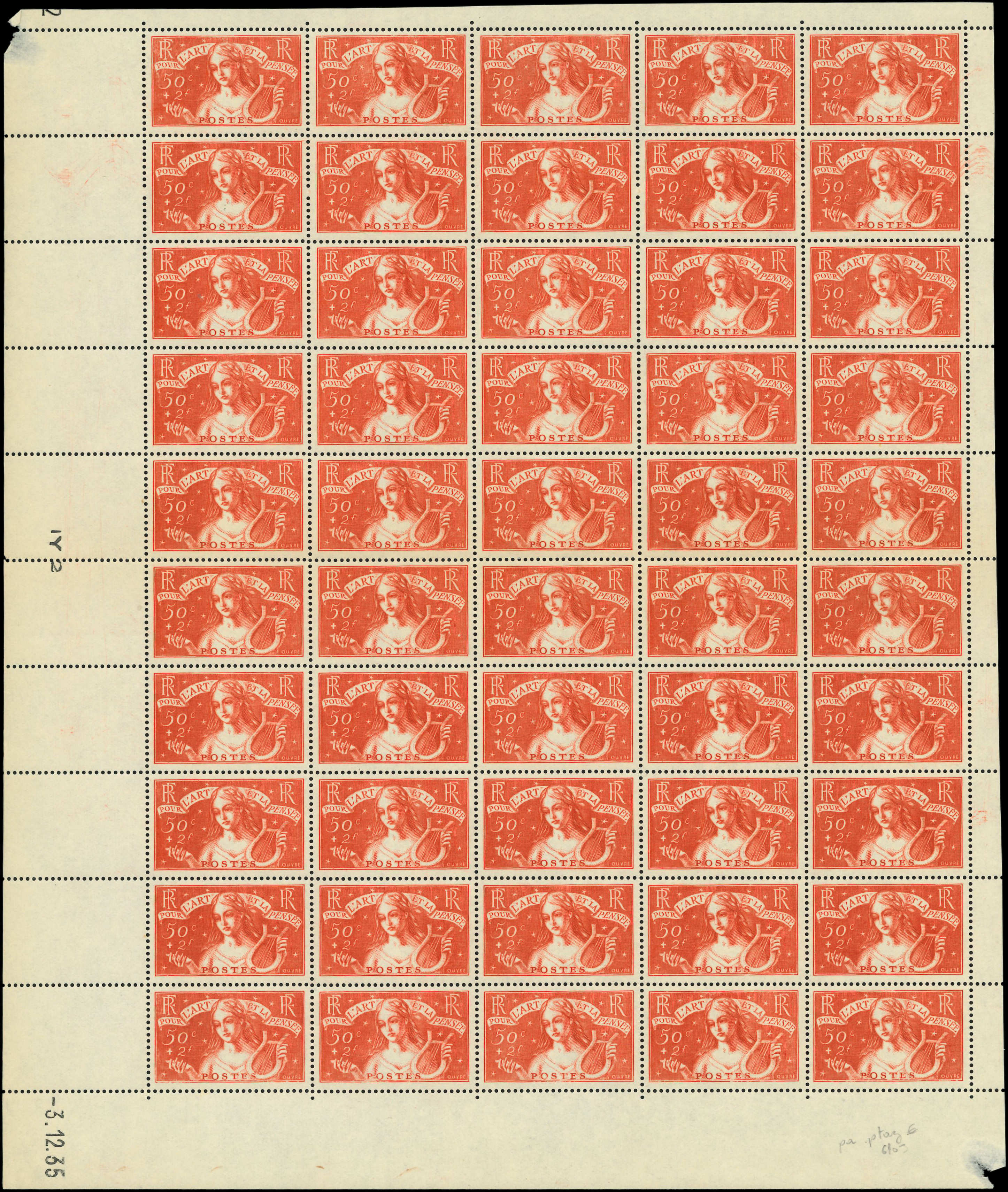 308 Art et Pensée, 50c. + 2f., FEUILLE de 50 CD 3/12/36, bords en partie coupés, TB