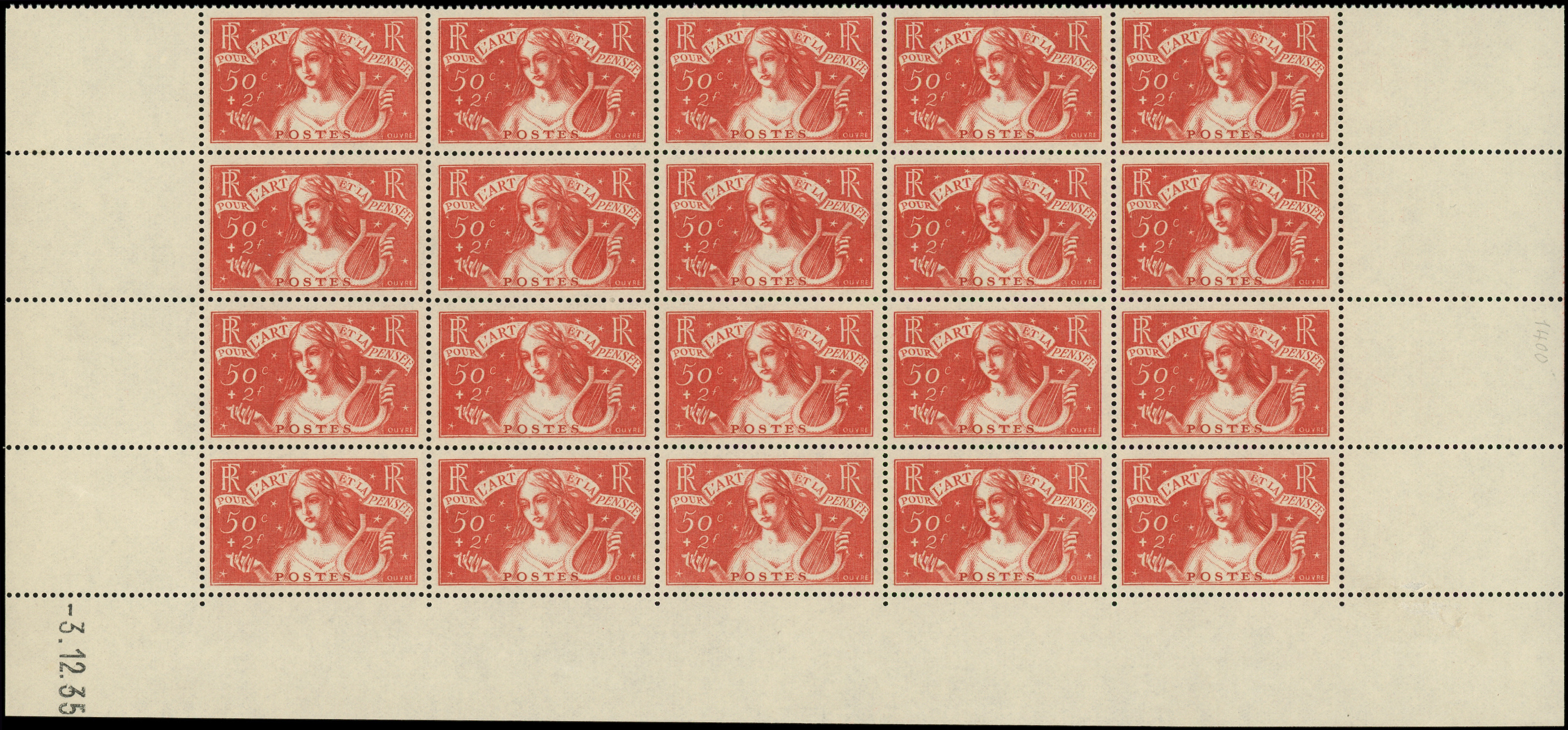 308 Art et Pensée, 50c. + 2f., BLOC de 20 cdf daté 3/12/35, TB