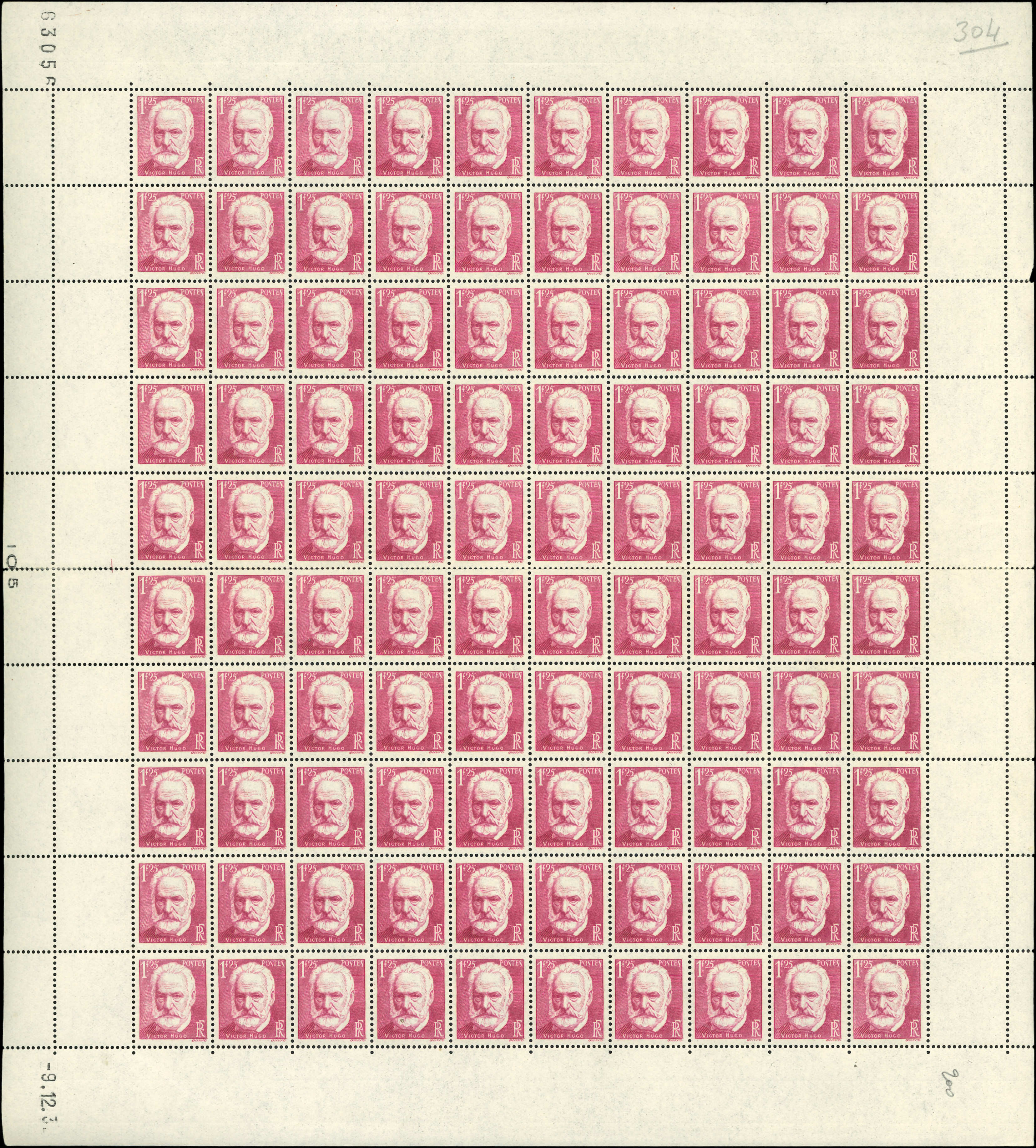 304 Victor Hugo, 1f.25 lilas-rose, FEUILLE de 100, découpée au centre et renforcée par des ch. sur les bords, TB