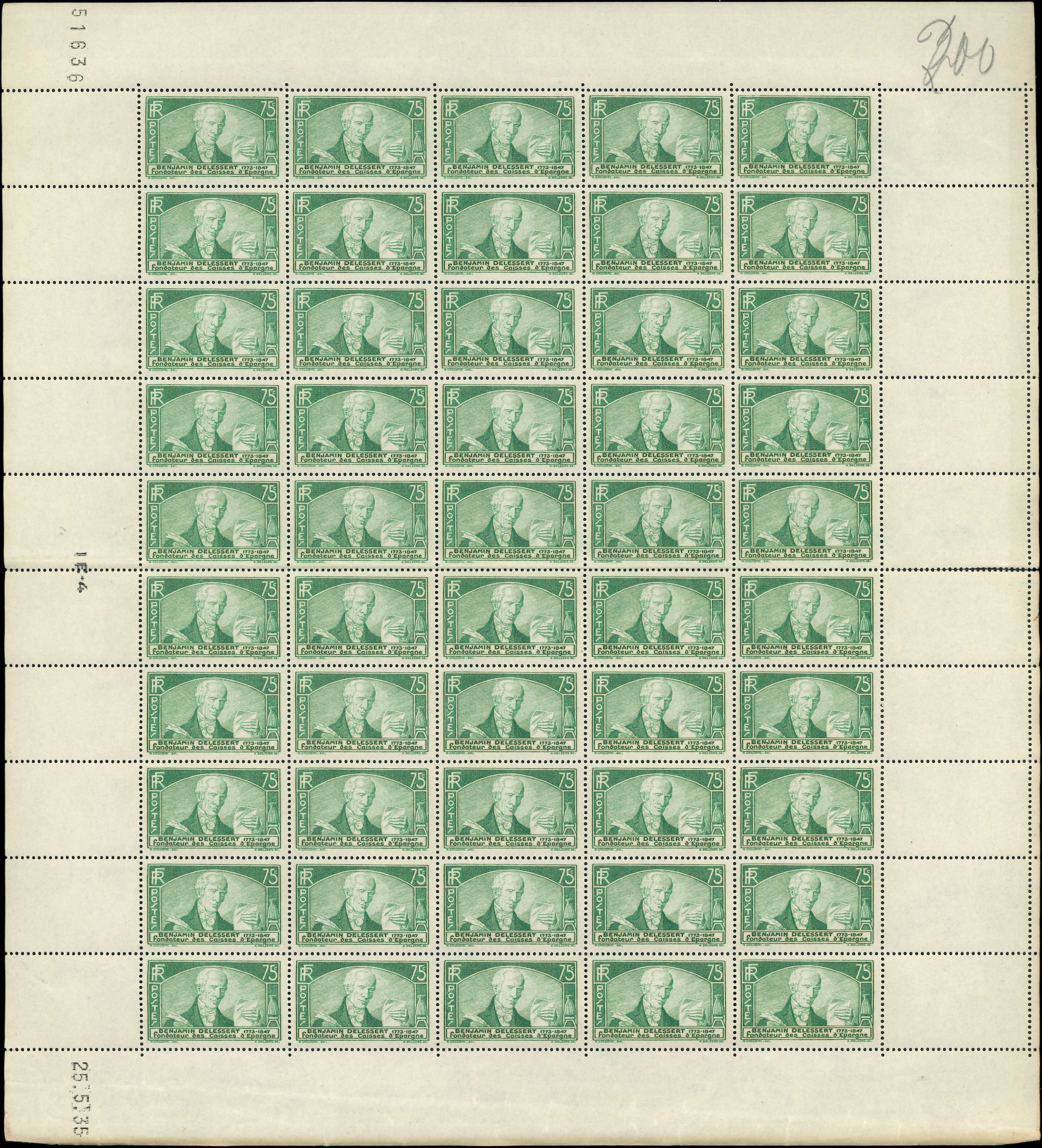 303 Delessert, 75c. vert, FEUILLE de 50 fortement pliée au centre, donc 5 ex. non comptés dans la cote, CD 25/5/35, TB