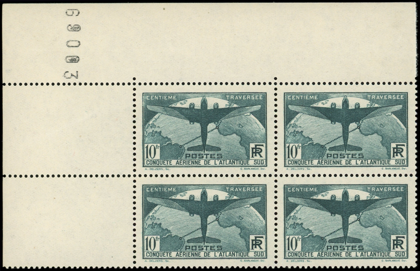 321 Atlantique Sud, 10f. vert foncé, BLOC de 4 cdf numéroté, TTB