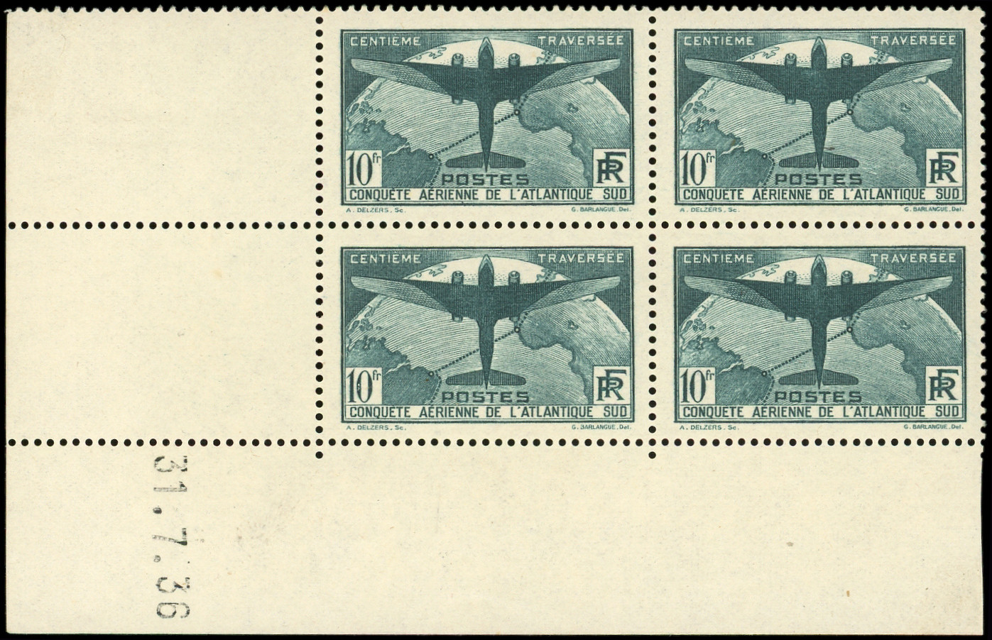 321 Atlantique Sud, 10f. vert foncé, BLOC de 4 CD 31/7/36, TB