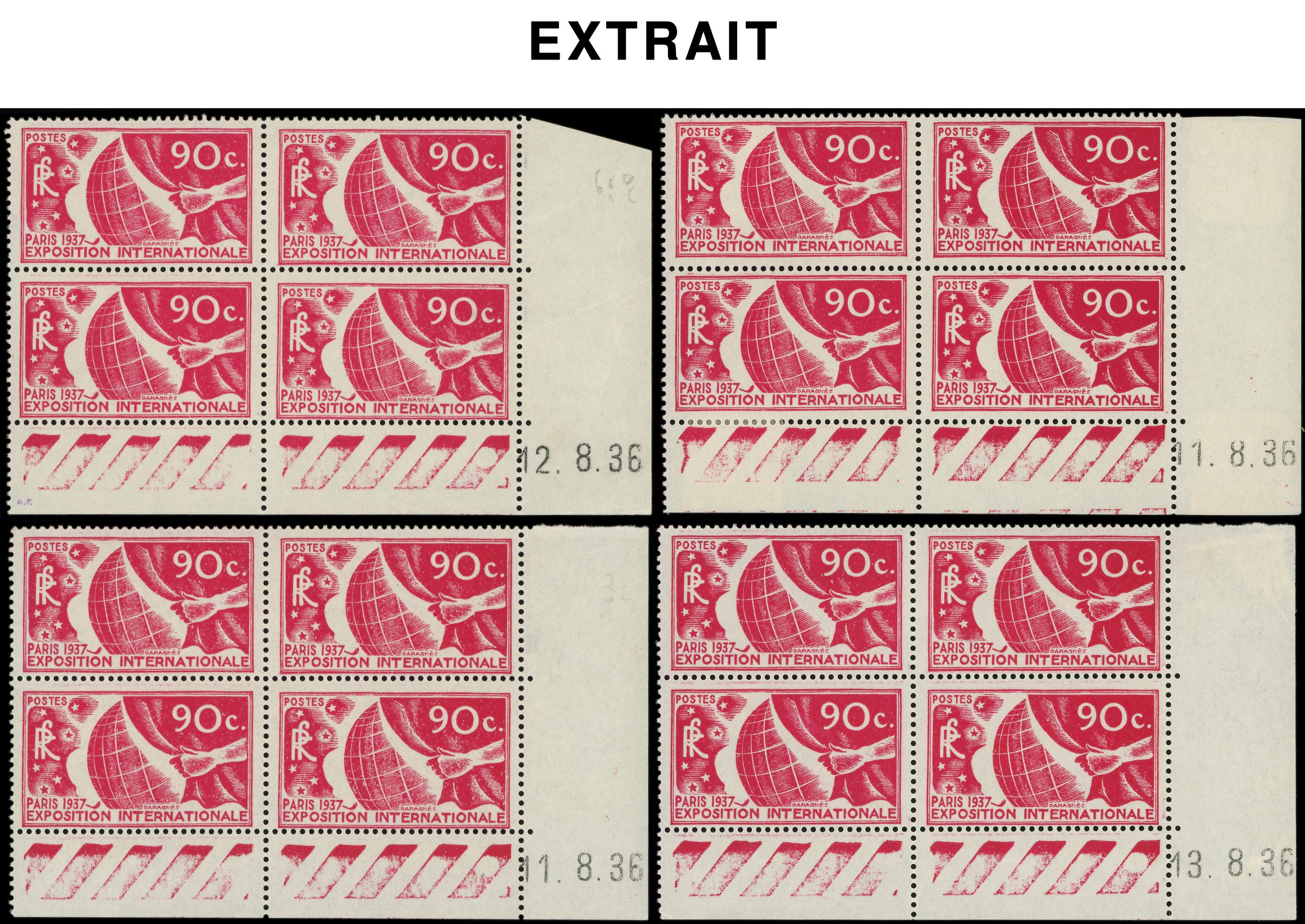 326 Expo Internationale 1937, 90c. rose carminé, 50 ex. la plupart en BLOCS de 4 CD, TB