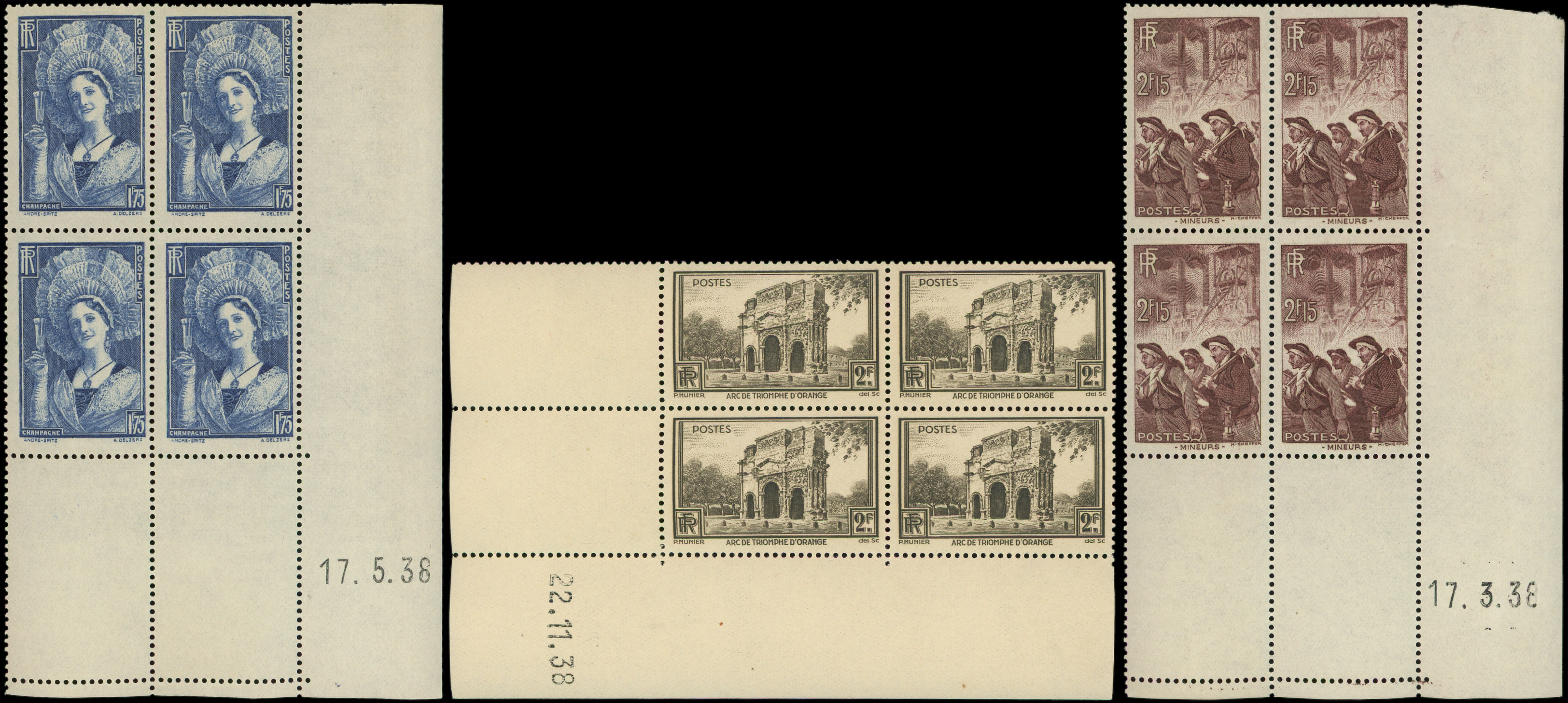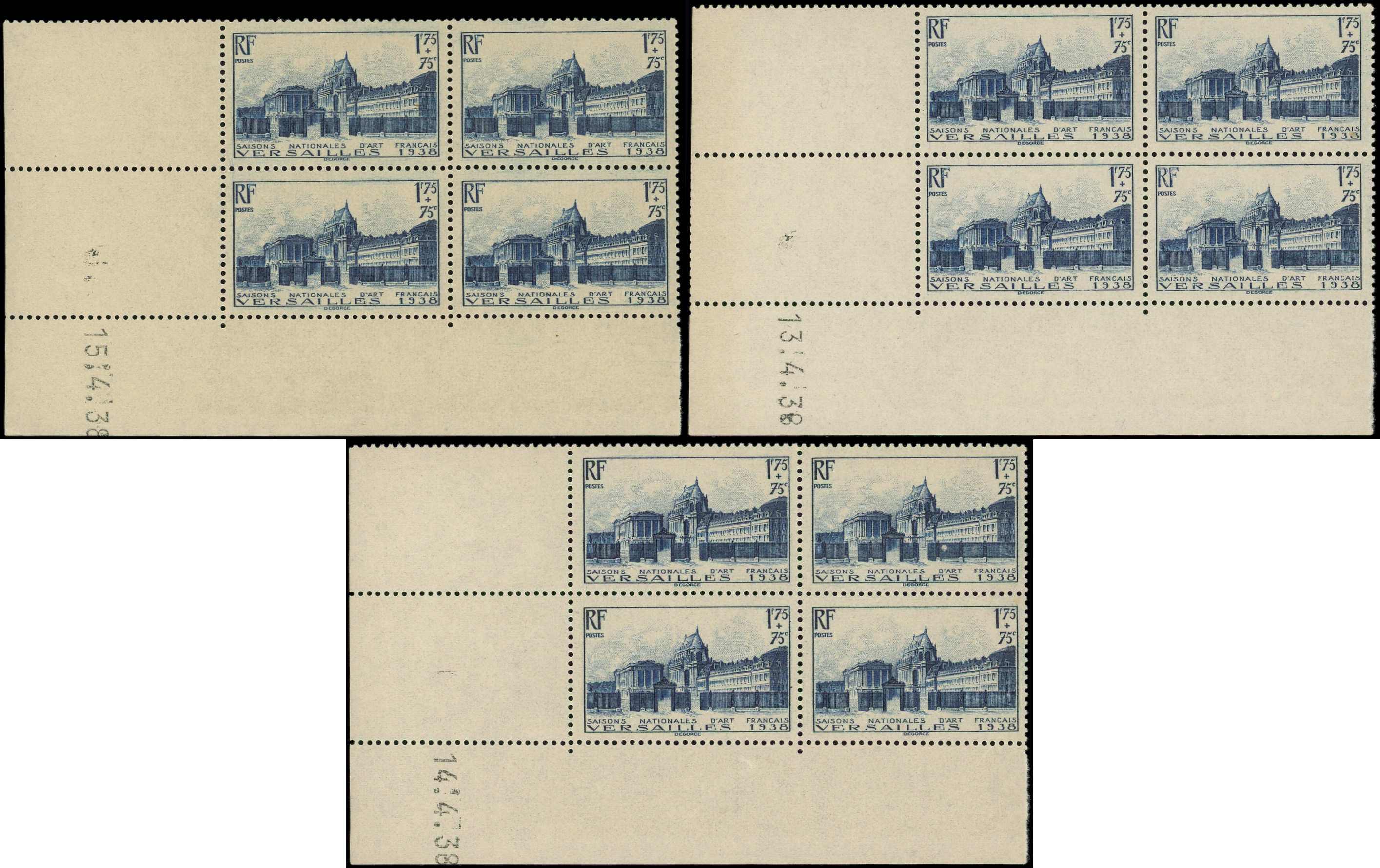 379 Versailles, 1f.75 + 75c. bleu, 3 BLOCS de 4 CD 13-15/4/38, TB