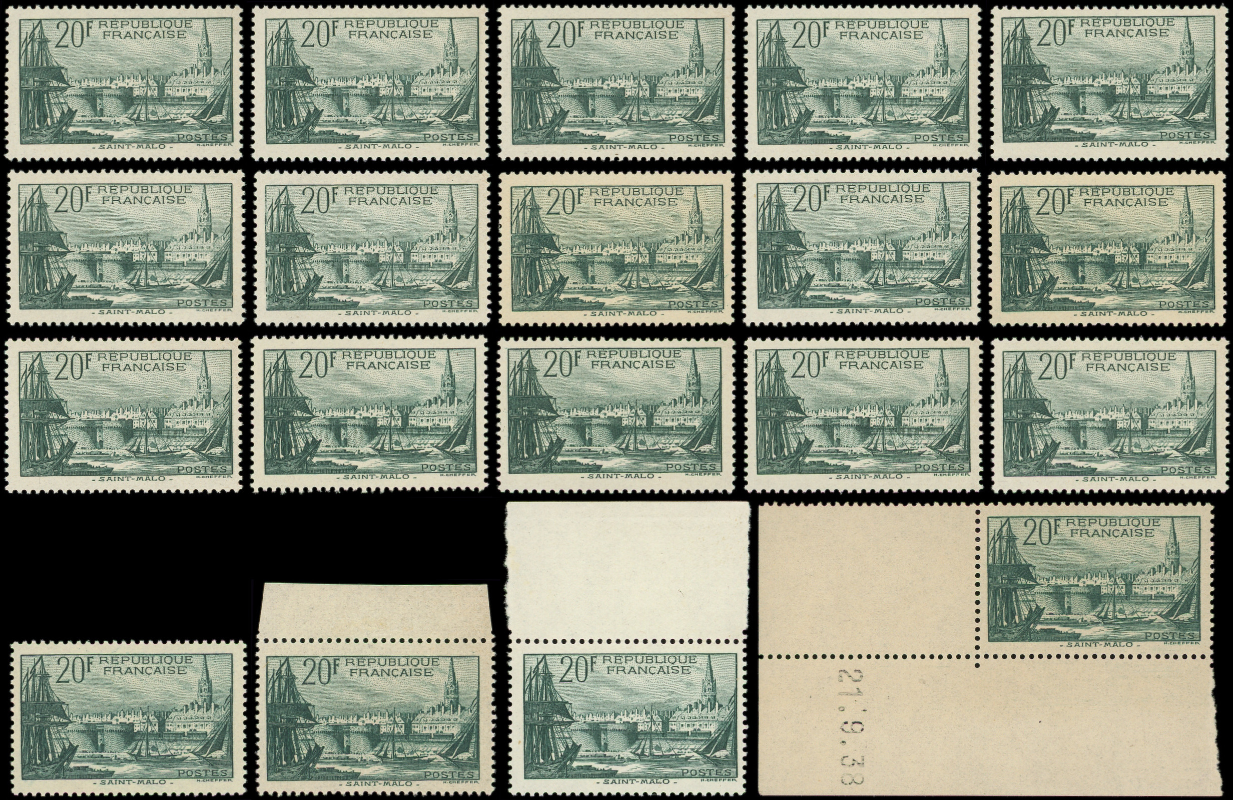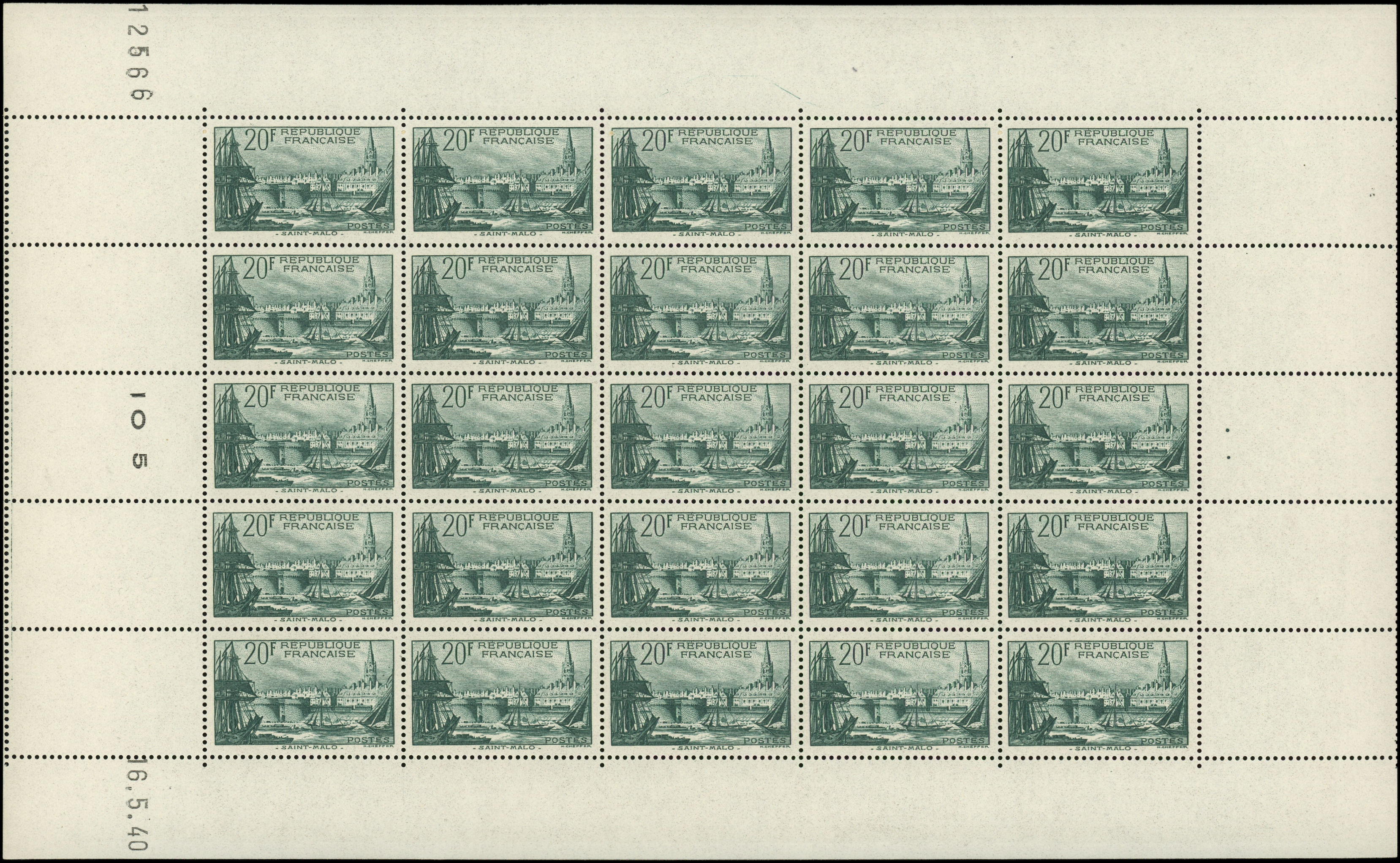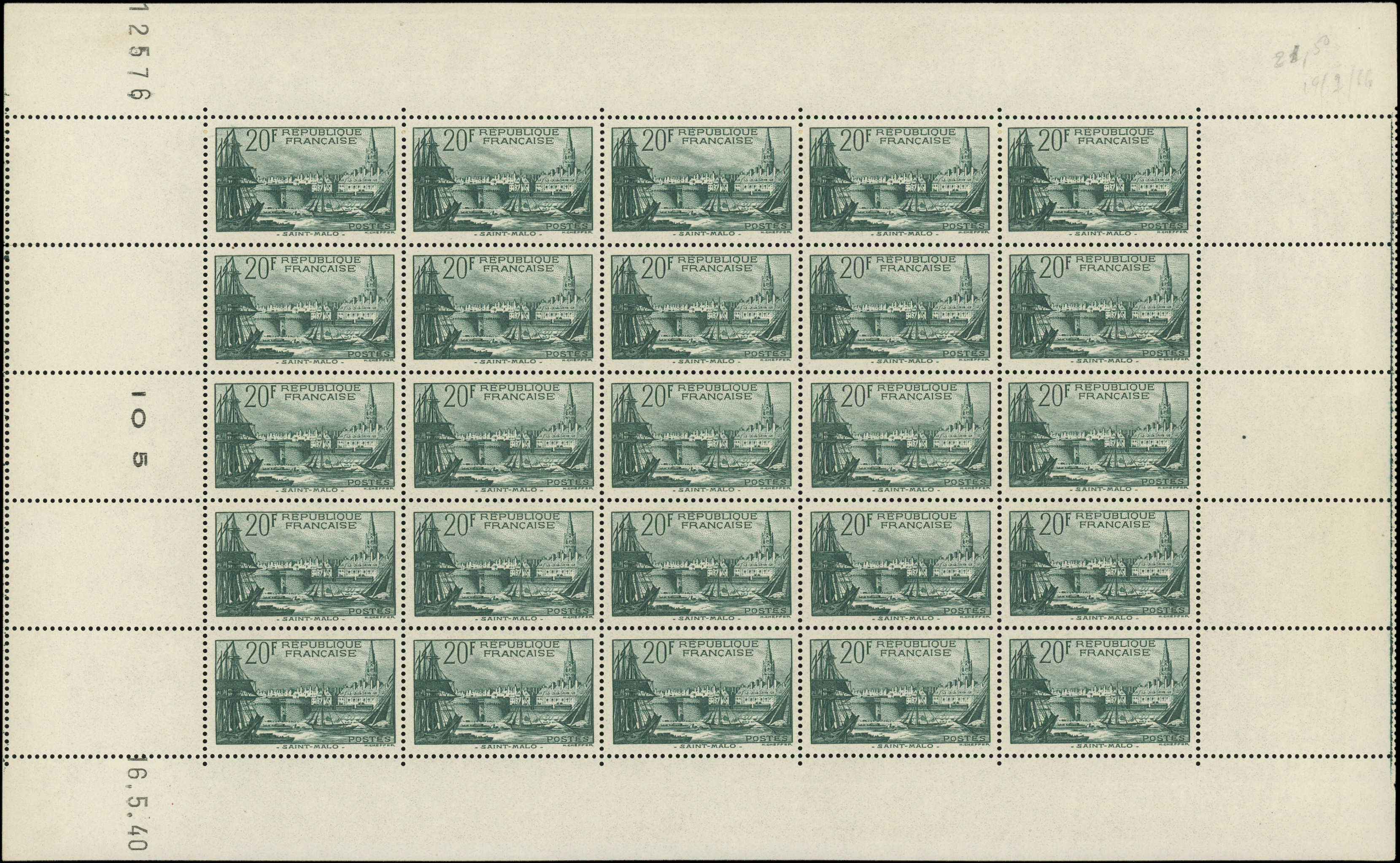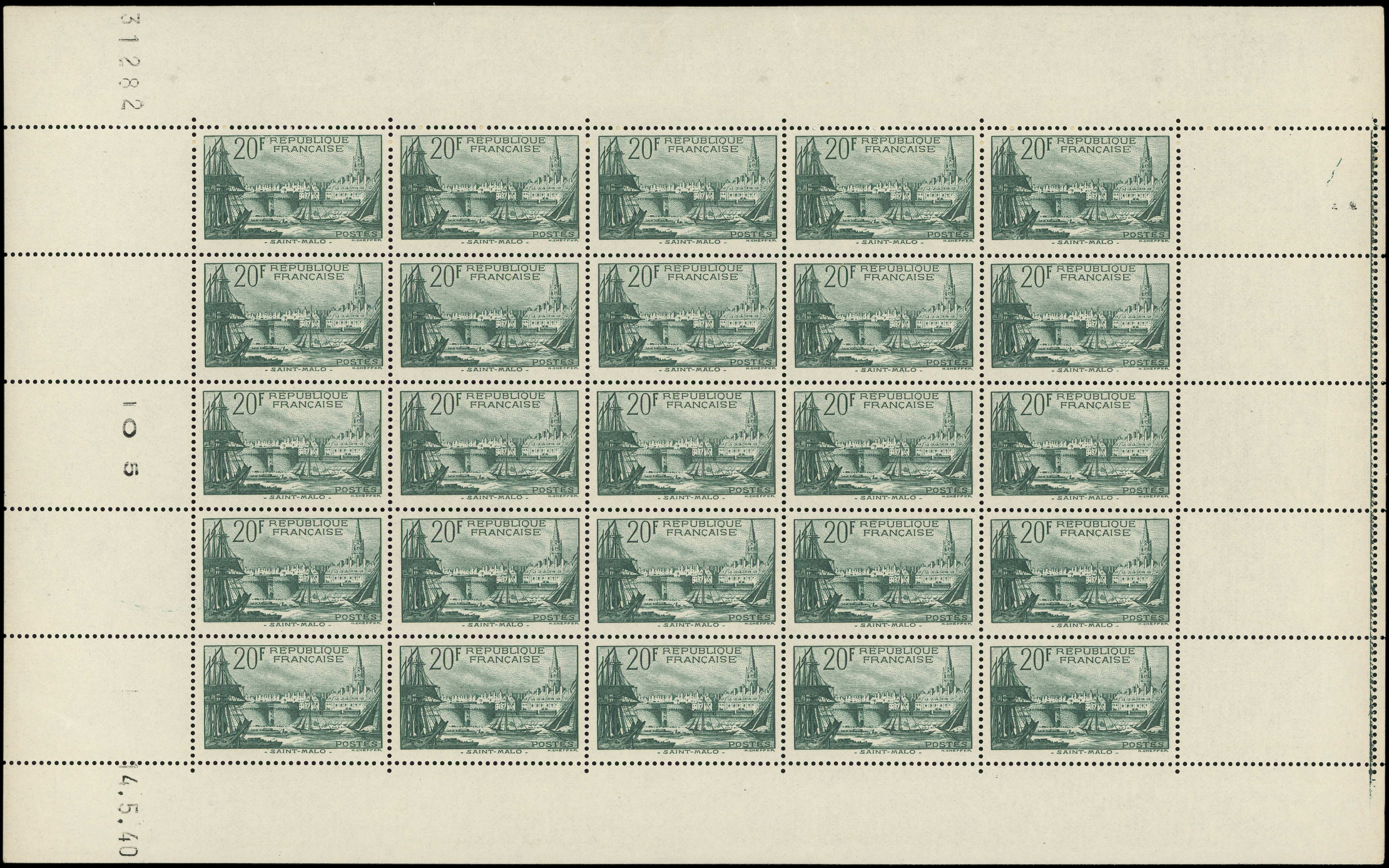394a St Malo, 20f. vert, papier épais, FEUILLE de 25 CD 16/5/40, TB