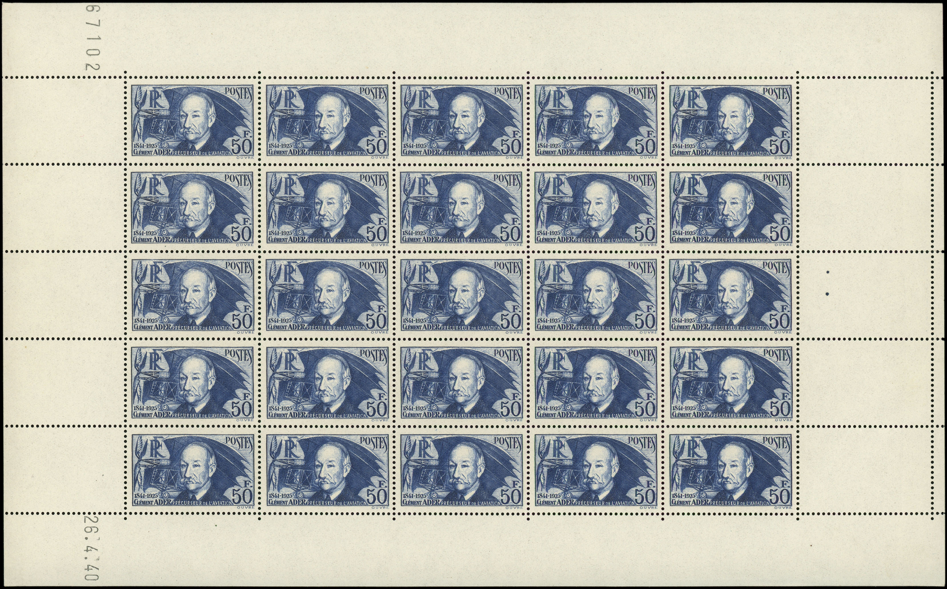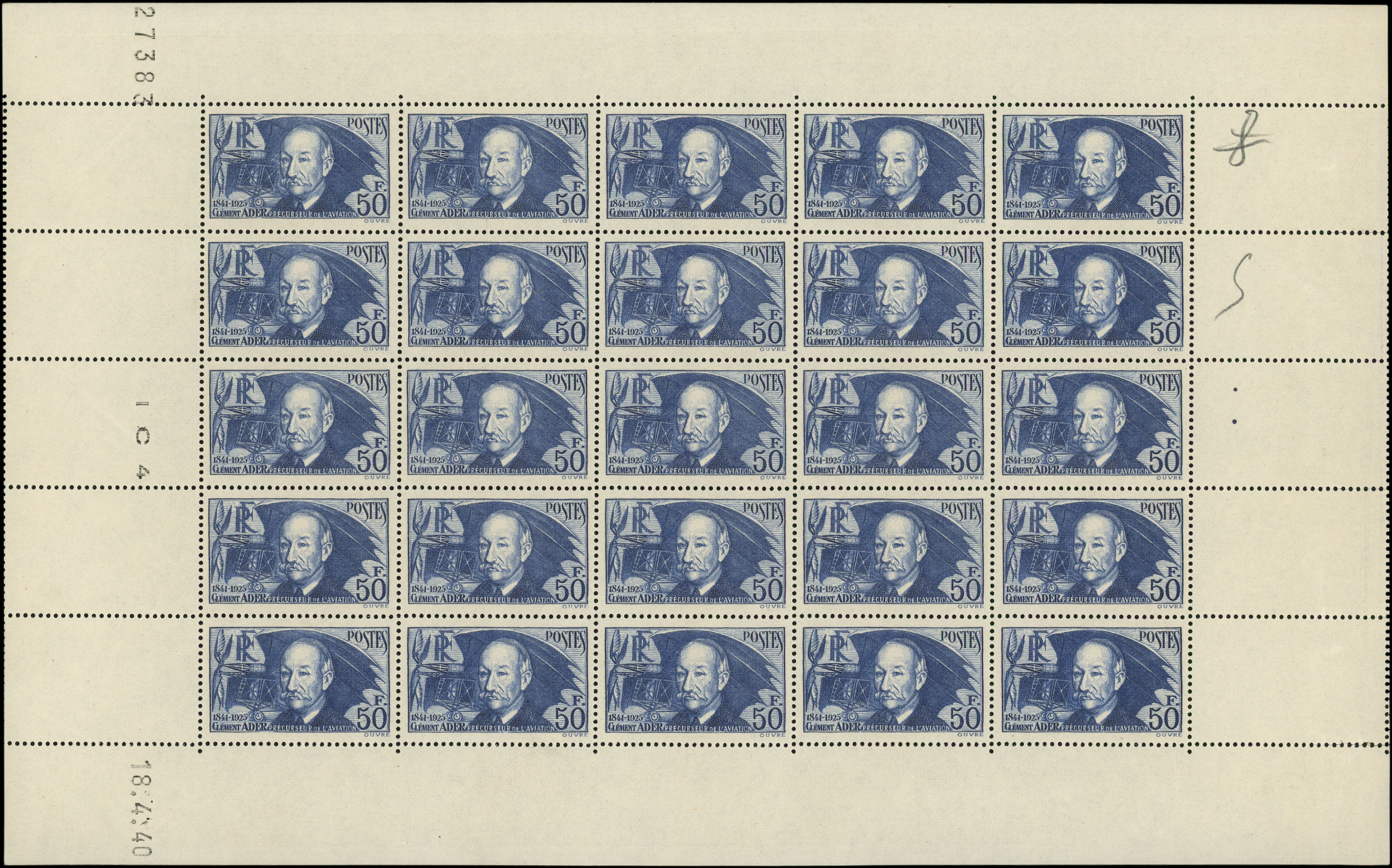 398a Clément Ader, 50f. outremer foncé, papier épais, FEUILLE de 25, CD 26/4/40, TB