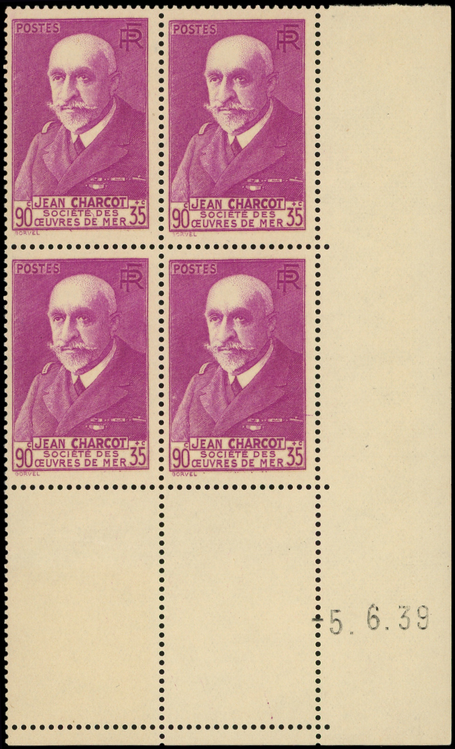377A Charcot, 90c. + 35c. lilas-rose, BLOC de 4 cdf daté 5/6/39, TB