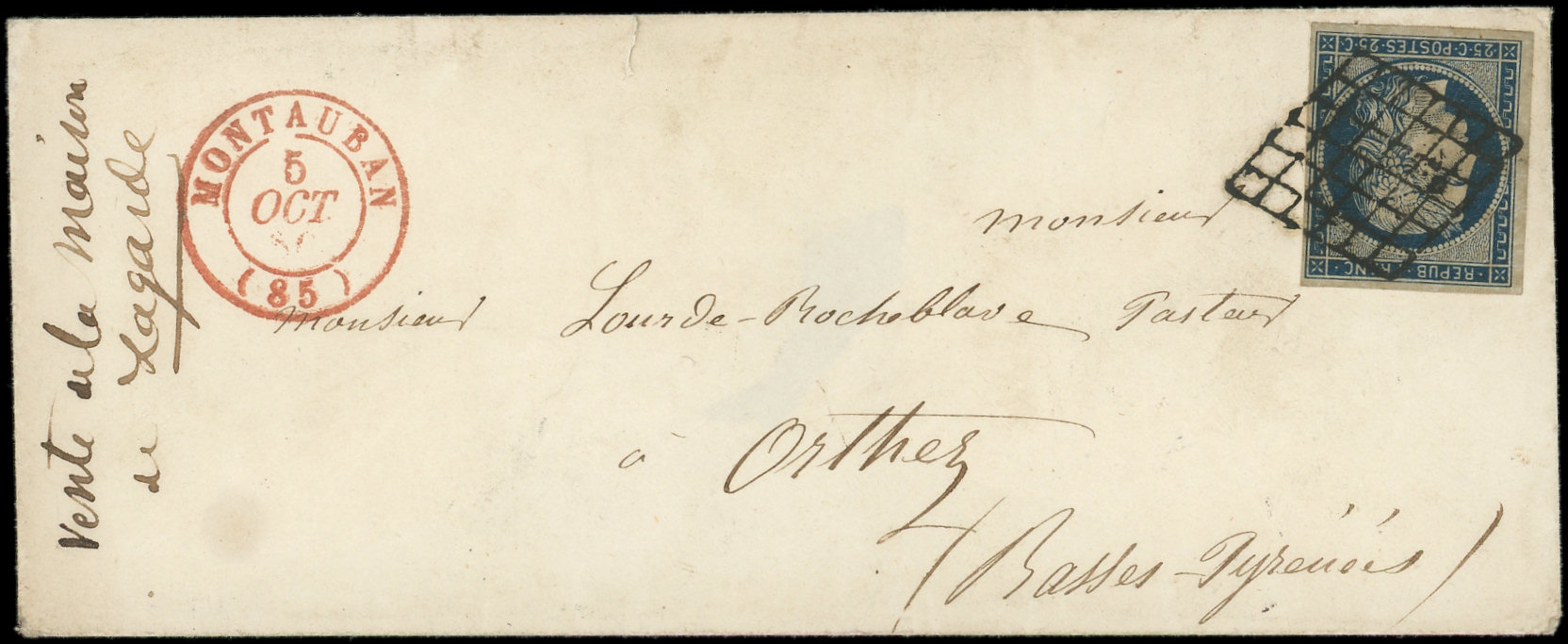 4a 25c. bleu foncé, obl. GRILLE s. Env., càd T15 MONTAUBAN 5/10/50 en ROUGE, RR et Superbe