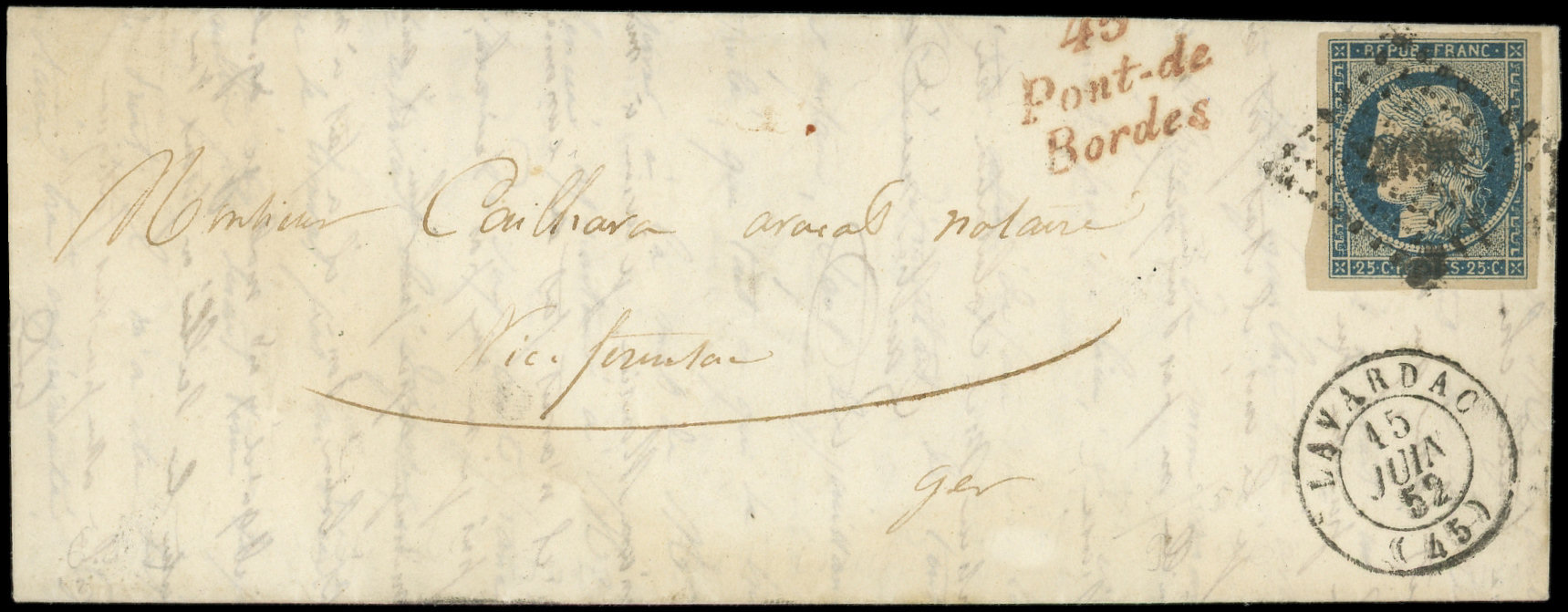 4 25c. bleu, obl. PC 2498 s. LAC, càd T15 LAVARDAC 15/6/52 et Cursive 45/PONT-DE/BORDES en ROUGE, TTB
