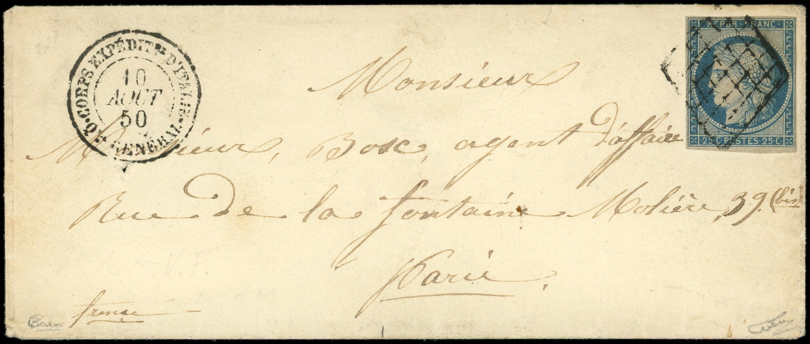 4 25c. bleu, obl. GRILLE s. Env., càd CORPS EXPEDITIONNAIRE D'ITALIE Qr GENERAL 10/8/50, pièce très Rare et Superbe