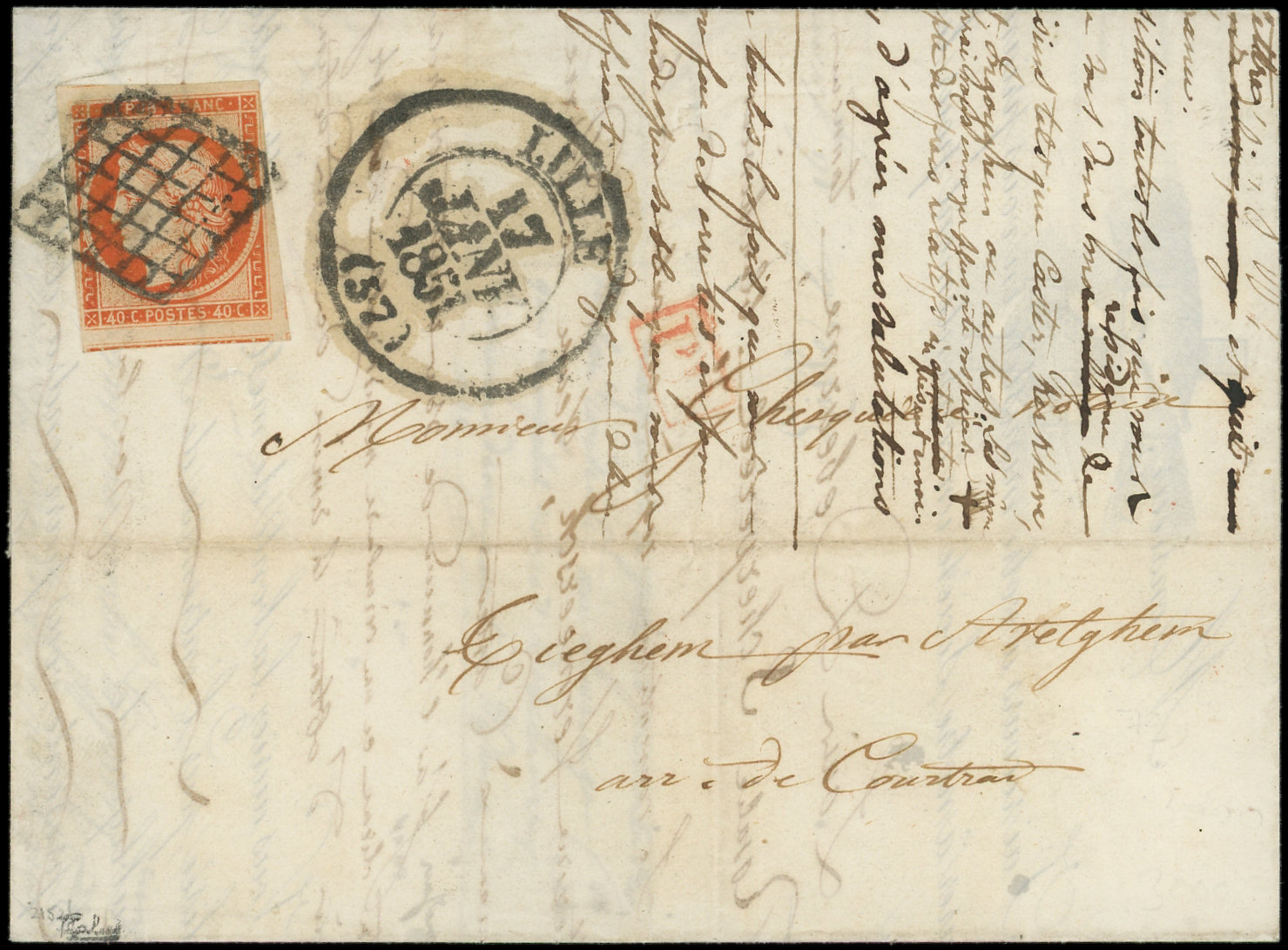 5 40c. orange, grandes marges, obl. GRILLE s. LAC, càd T13 LILLE 17/1/51, arr. càd rouge belge AVELGHEM, TTB