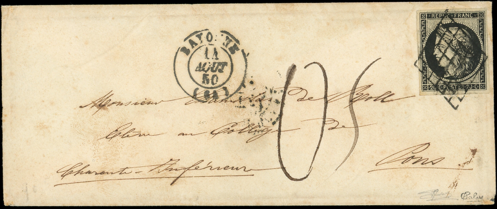3a 20c. noir sur blanc, obl. GRILLE s. Env., càd T15 BAYONNE 11/8/50 et Taxe Plume 05, tarif 25c. depuis le 1/7, TTB C