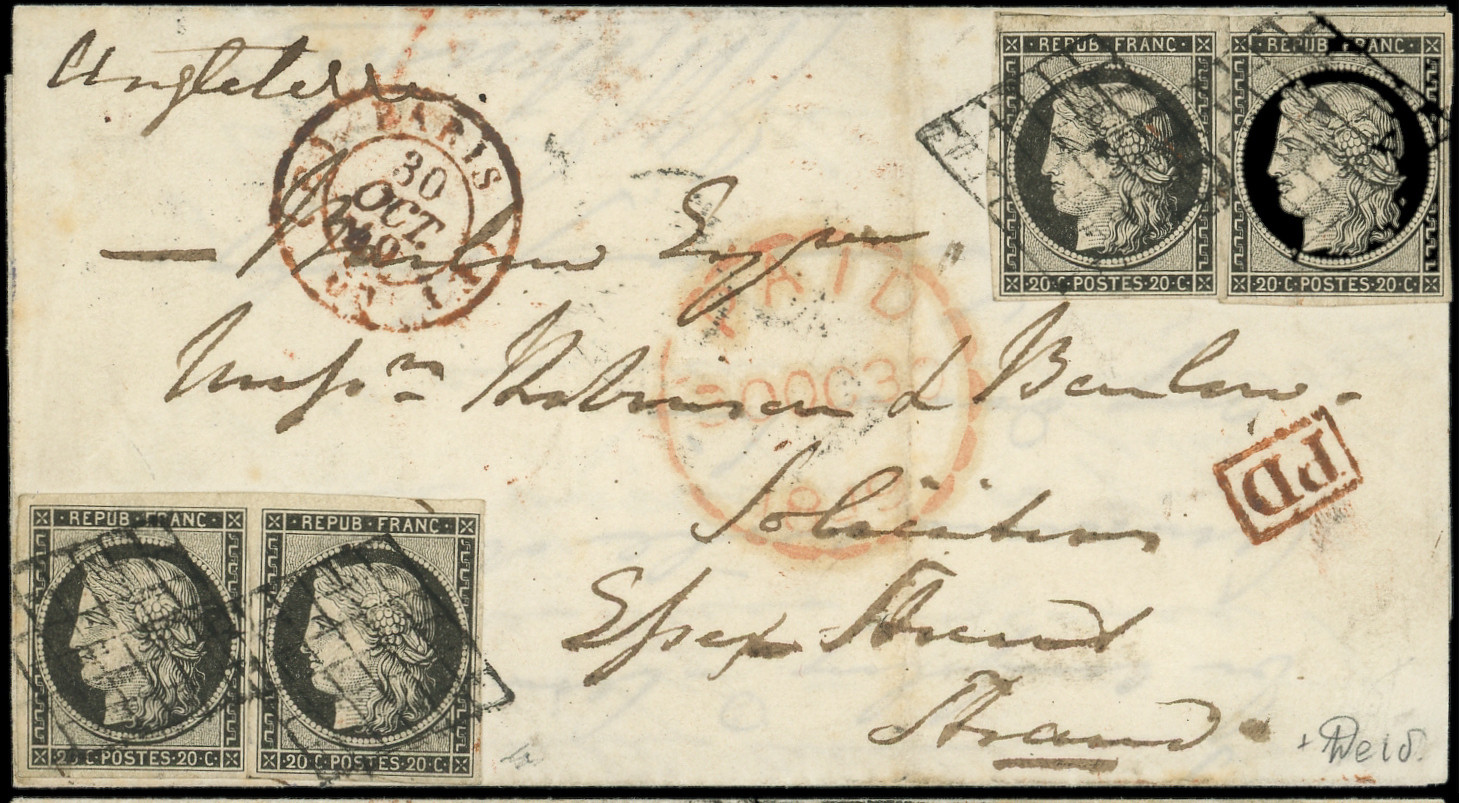 3a 20c. noir sur blanc, 4 ex. obl. GRILLE s. LAC, càd ROUGE (E) PARIS (E) 30/10/49, arr. LONDON, affrt RR et TTB