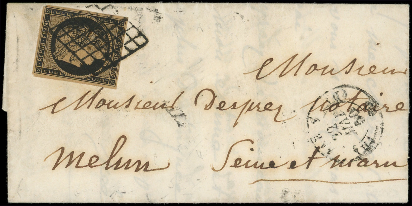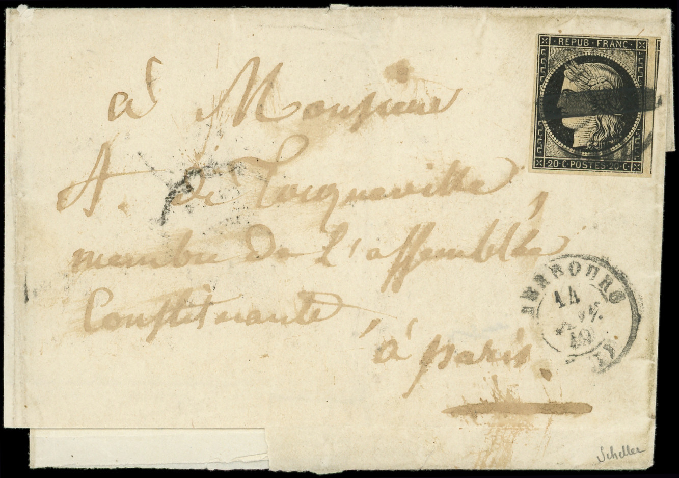 3 20c. noir sur jaune, obl. de la BARRE NOIRE épaisse et du càd T15 de CHERBOURG 14 JANV 49, ce dernier répété à côté s. LSC, grande RARETE des oblitérations PROVISOIRES de Janvier 1849, TB, certif. Scheller