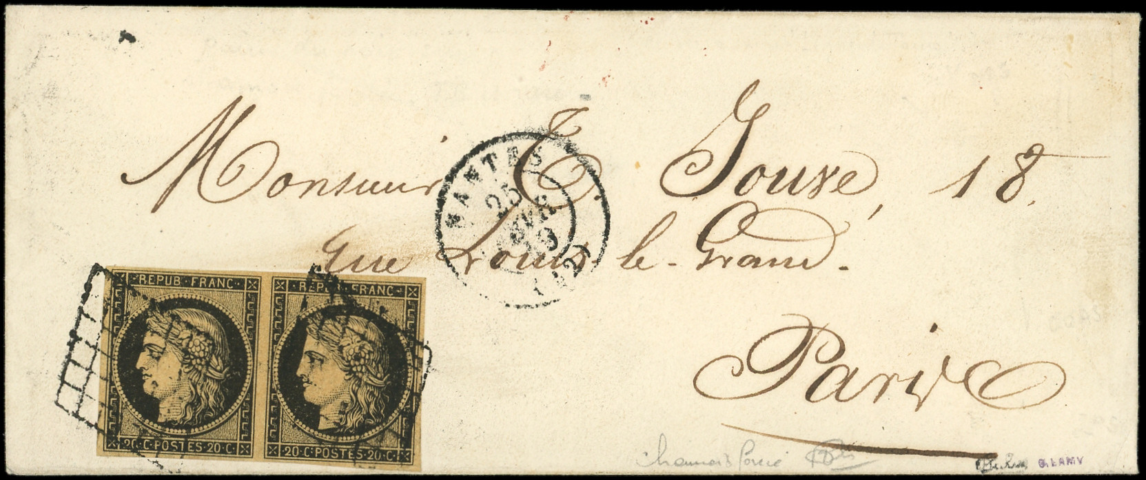 3b 20c. noir sur CHAMOIS FONCE, PAIRE obl. GRILLE s. Env., càd T15 NANTES 25/2/49, nuance certifiée Calves, Superbe