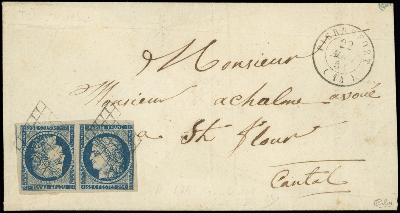 T4 25c. bleu, TETE BECHE obl. GRILLE s. Env., càd T15 PIERREFORT 22/8/51, TTB. C