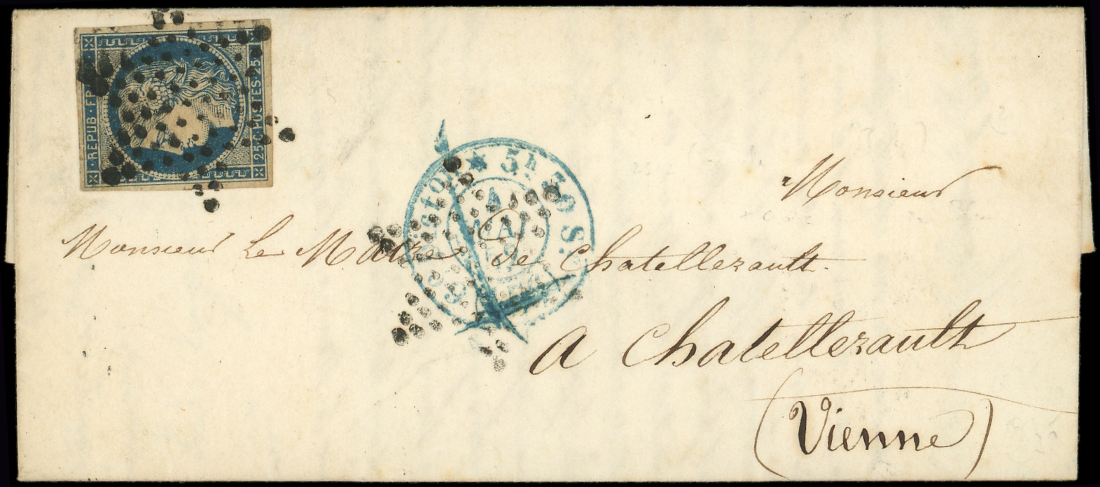 4 25c. bleu, obl. ETOILE s. LAC, càd bleu de Levée 6e Diston 5h30 4/5/52, annulé de la plume bleue et de l'Etoile, arr. Chatellerault 5/5, très intéressant et TTB