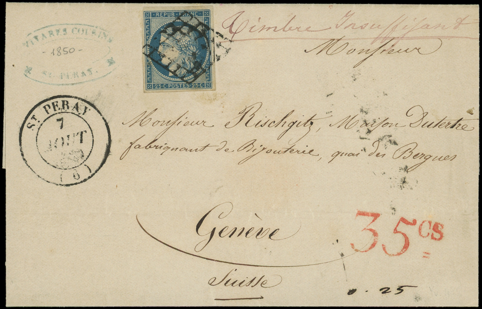 4 25c. bleu obl. GRILLE s. LSC, càd T14 St PERAY 7/8/50, TAXE 35cs en ROUGE et arr. GENEVE 9/8, TB